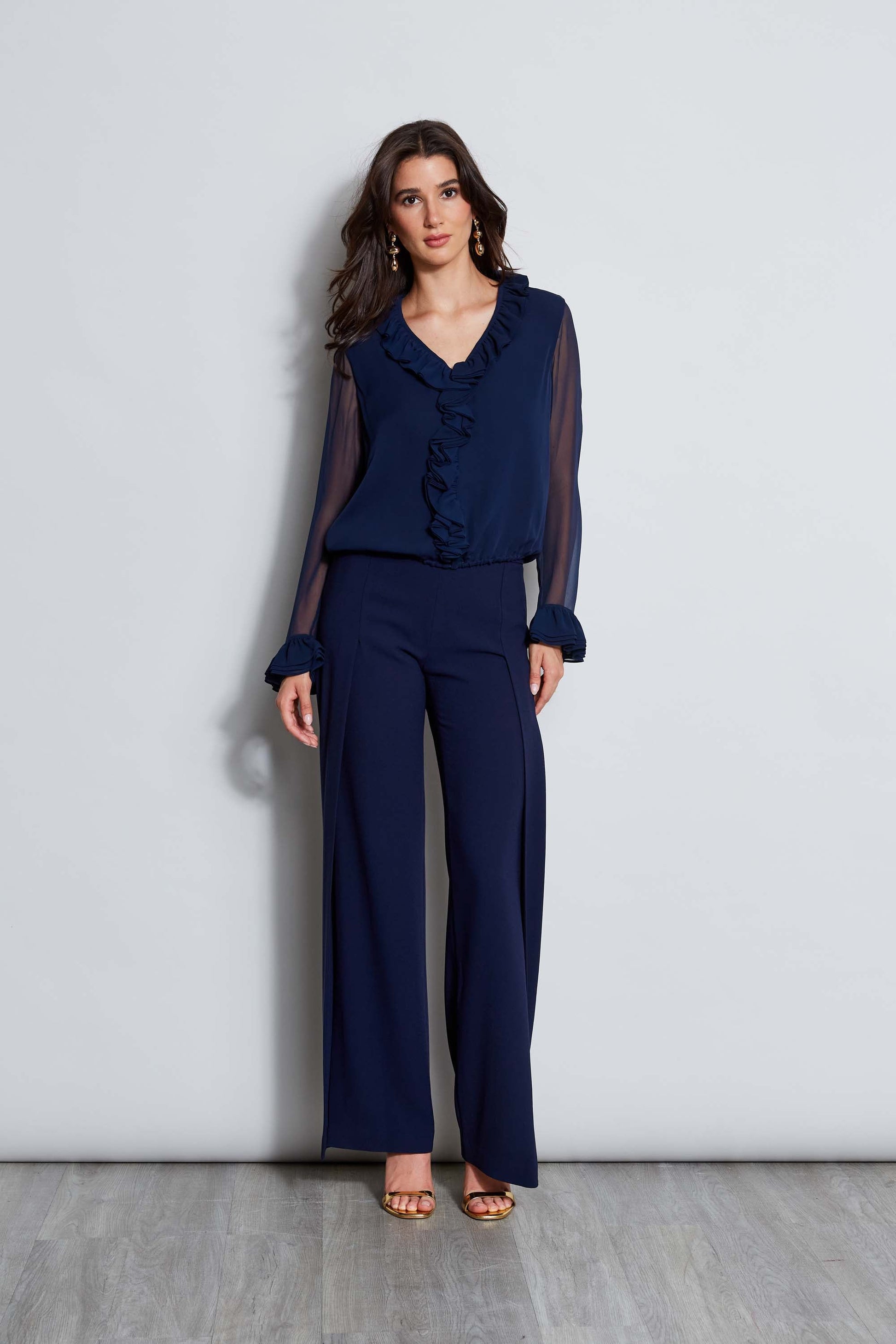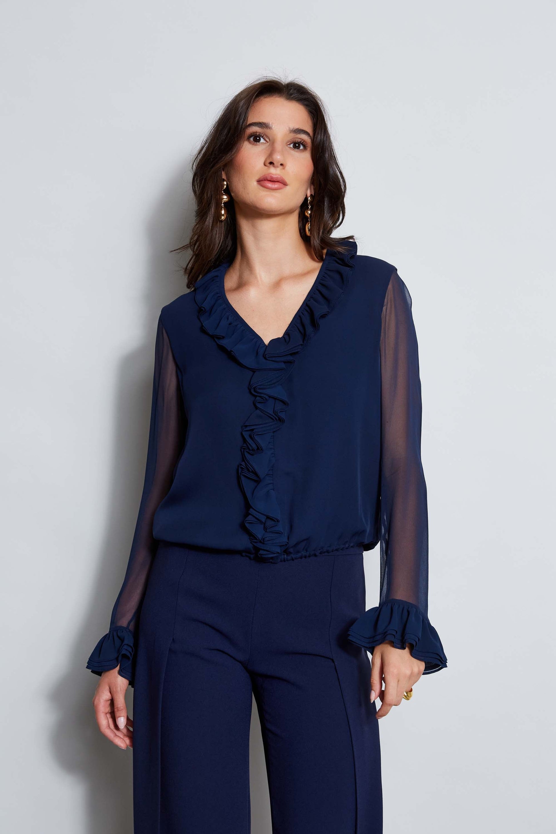• Long Sleeve Silk Ruffle Top with Chiffon Sleeves