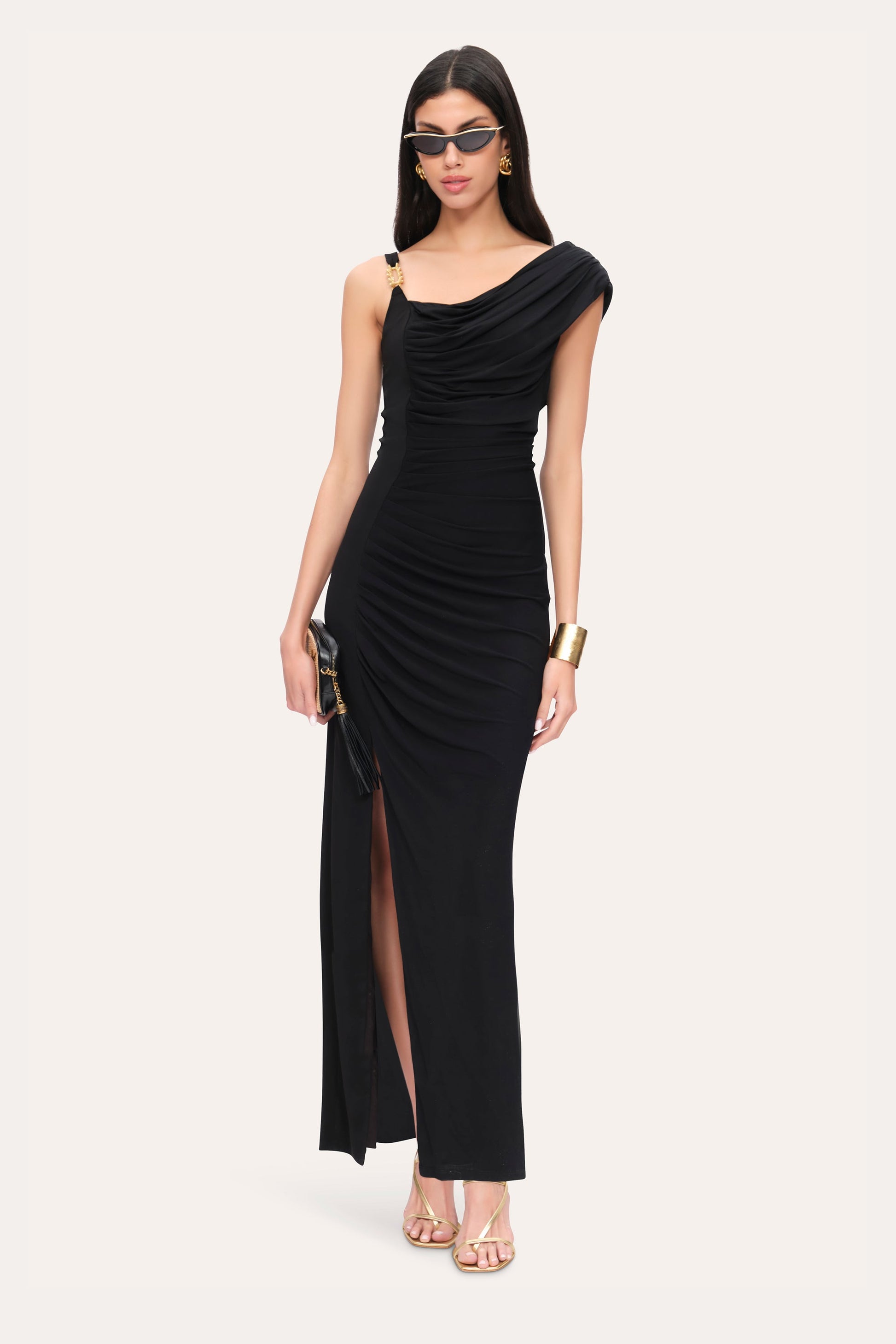 The hardware detail — chain jewelry straight from Italy —adorning the strap, plus the high slit, provide an edge. Contour ruching and matte jersey fabric lend ease. The result is an