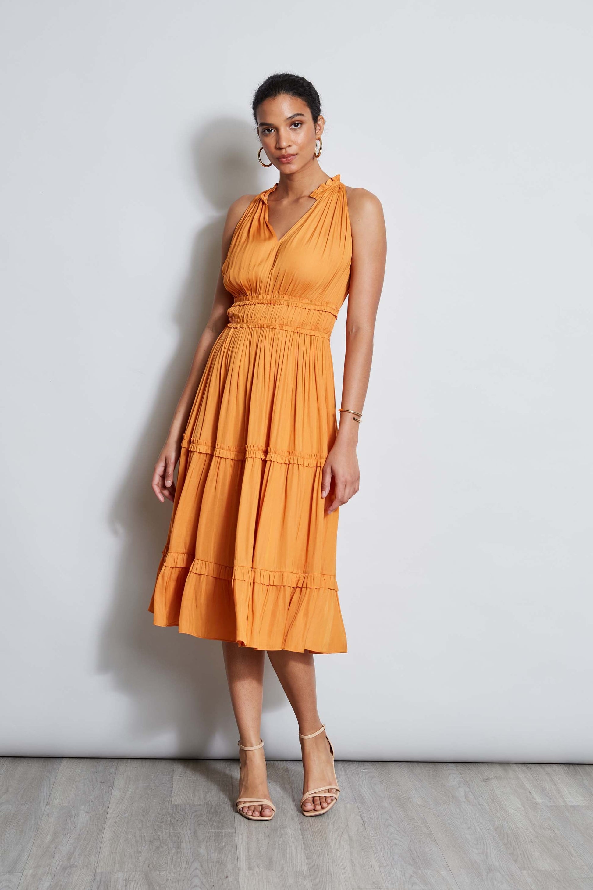 • T-Tahari Sleeveless Midi Dress with Ruffle Detailing, Smocking and a Tiered Skirt