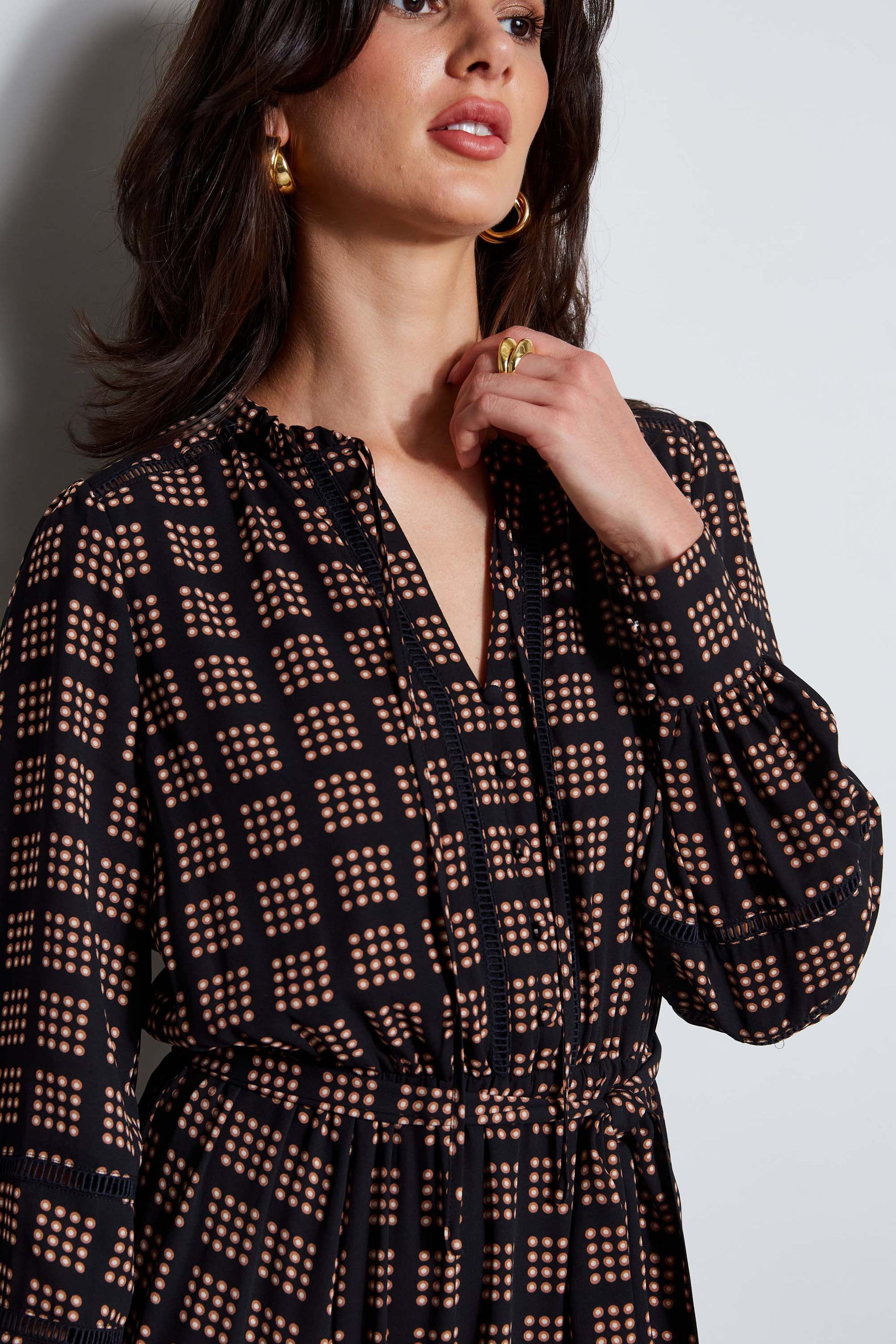 Elevate your style with our chic Dot Midi Dress. The sophisticated engineered graph dot print lends a modern vibe to this timeless silhouette. With an asymmetric Midi Hem & split neckline, this dress embodies effortless luxury, making it a perfect choice for those who seek sophistication without compromising on comfort.