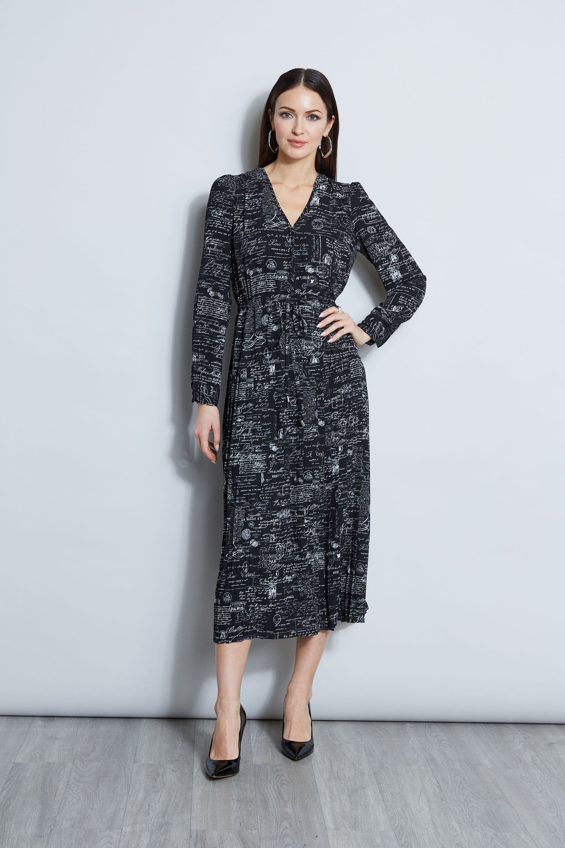 We love our chic Script Print Midi Dress. Meet our feminine, endlessly versatile shirtdress in luxe printed Georgette that's infused with a casual chic vibe. The accentuating waist tie, button front bodice, & full skirt have the cool factor you want.Dress it up with strappy heels or dress down or with your favorite sandals.