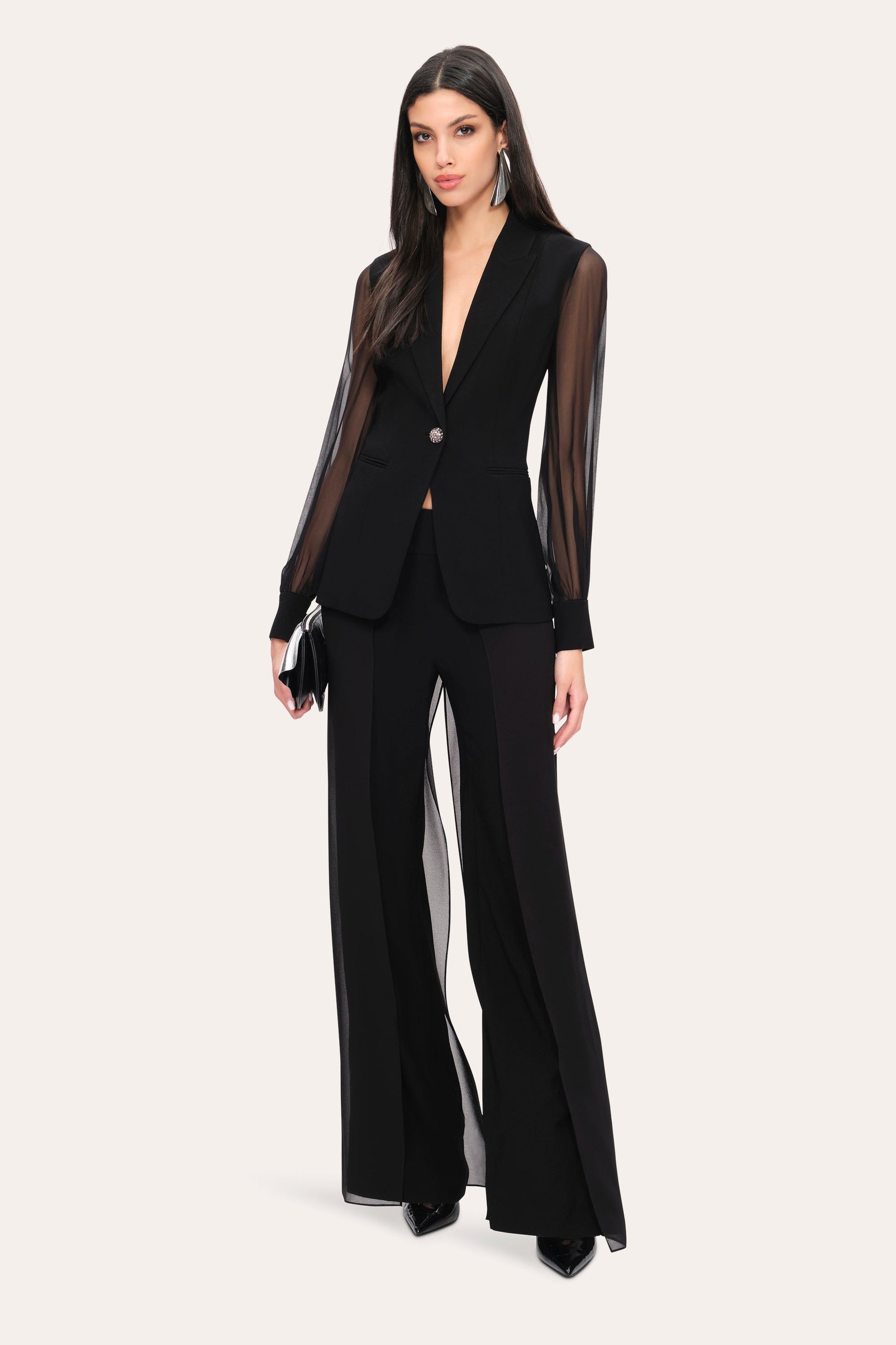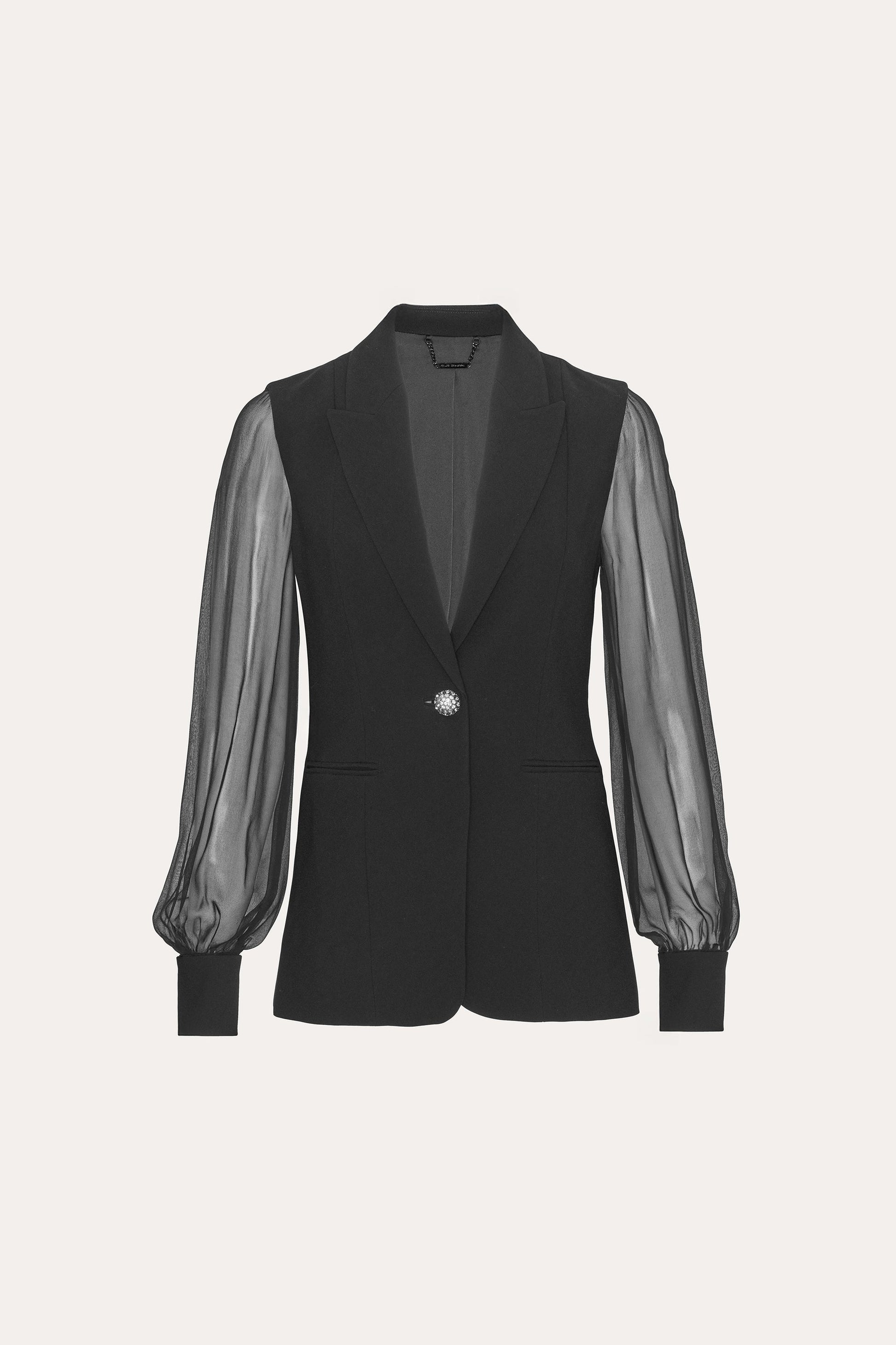 • Single Breasted Blazer with Silk Chiffon Sleeves & Jewel Button Closure