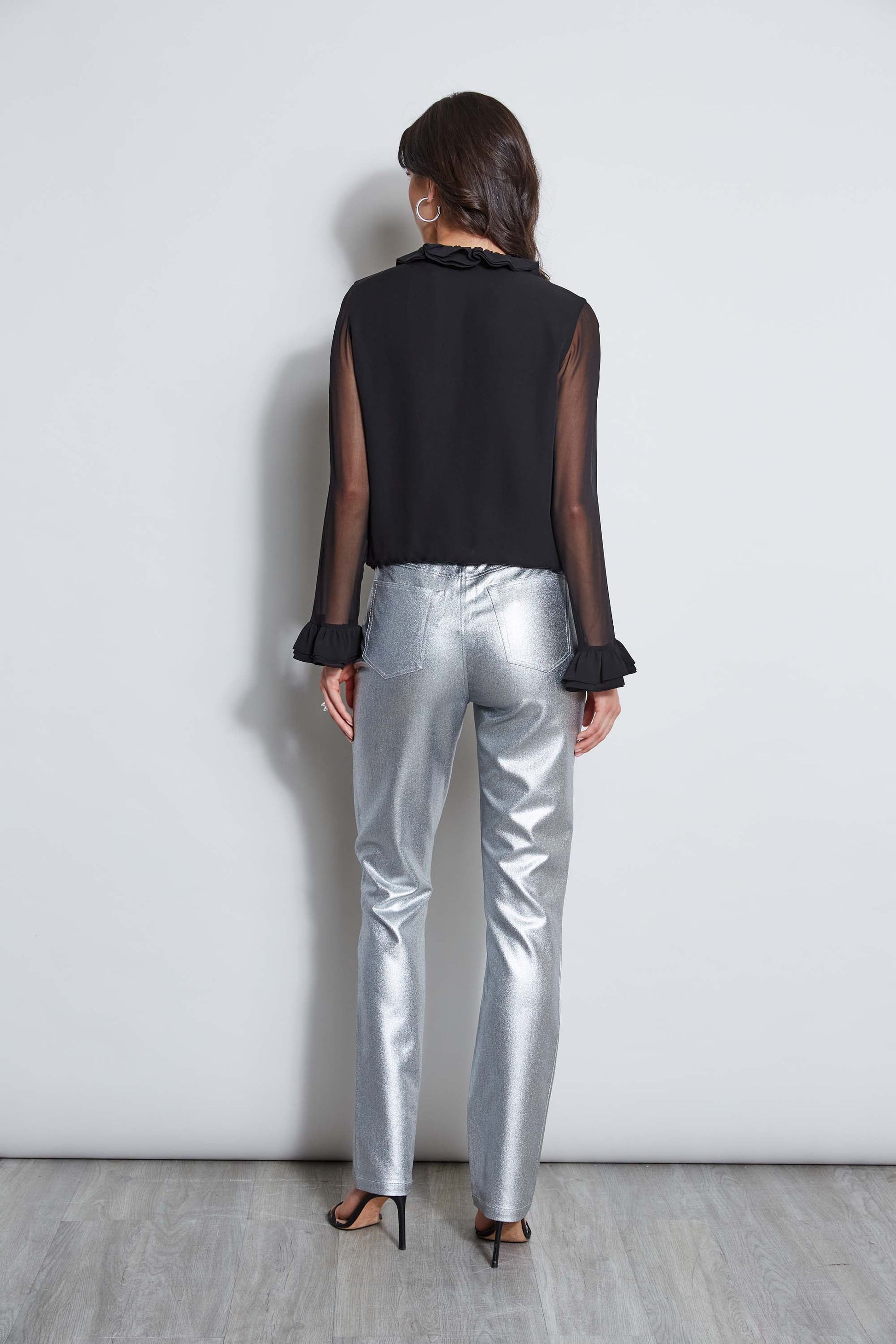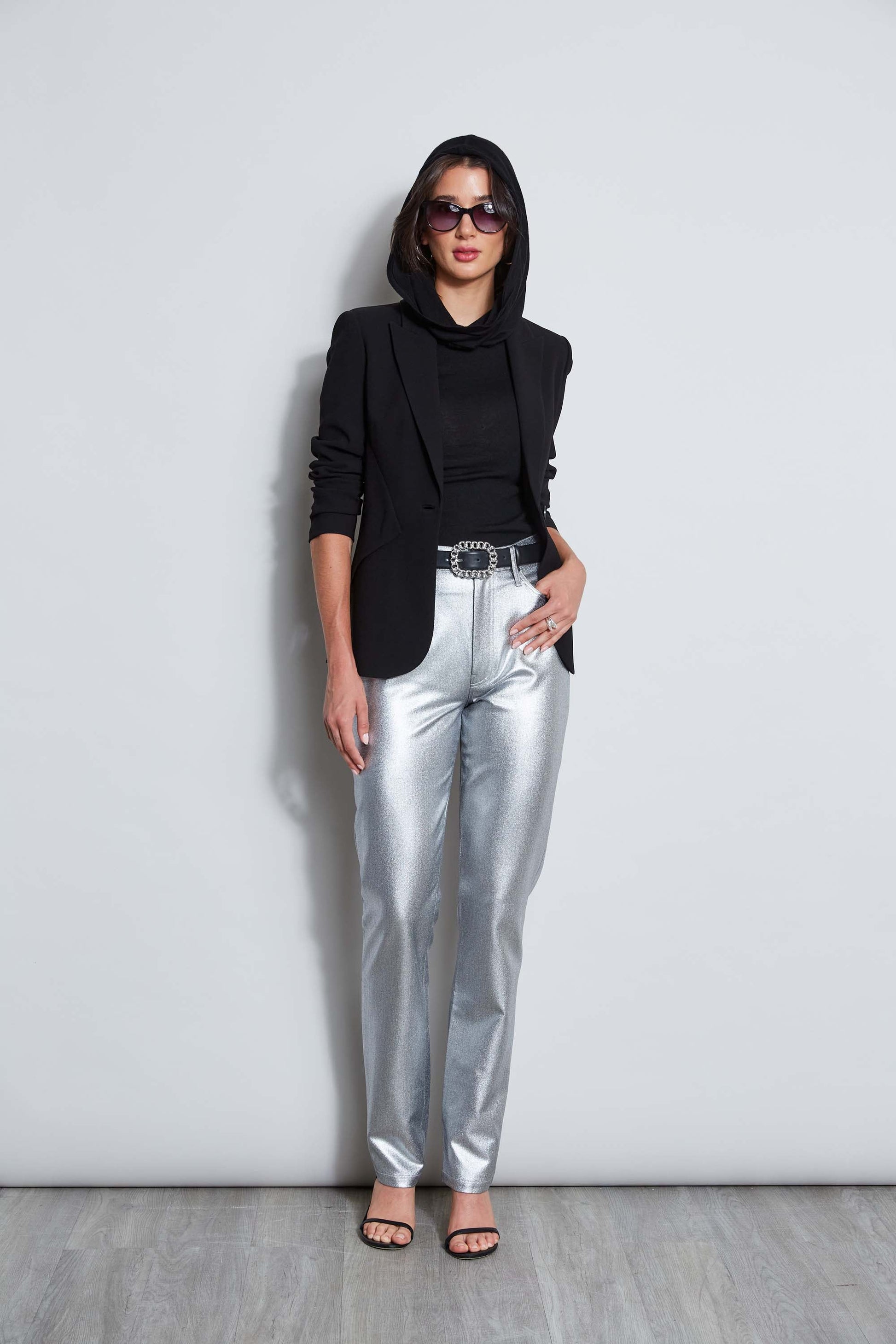 These will be the glam pants you can't get out of your head. Soft to the touch, you will fall in love with our Metallic Stretch Twill Pant. The jean styling & modern straight leg cut give it a cool vibe perfect for pairing with our luxe cashmere sweaters or crepe blazers.
