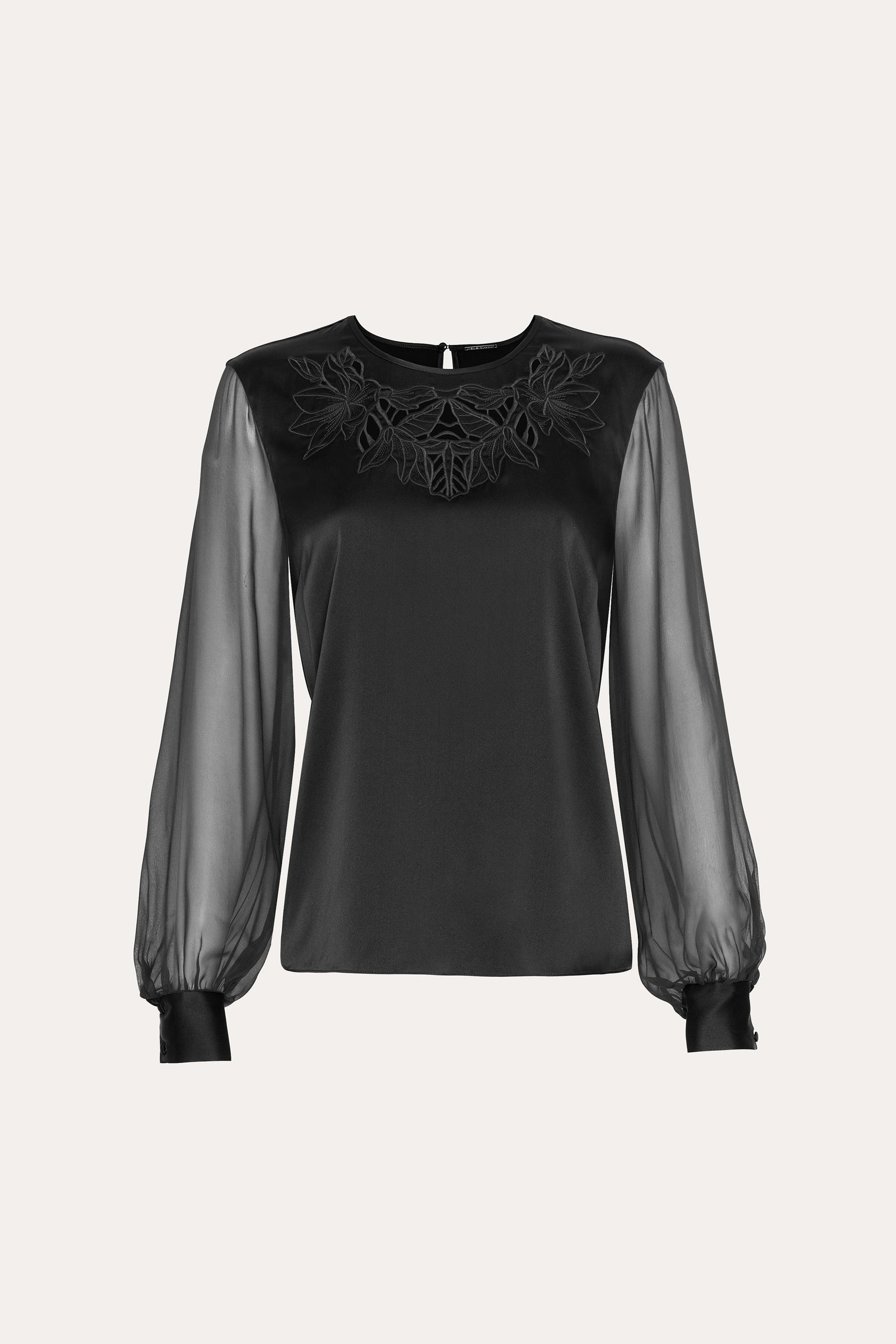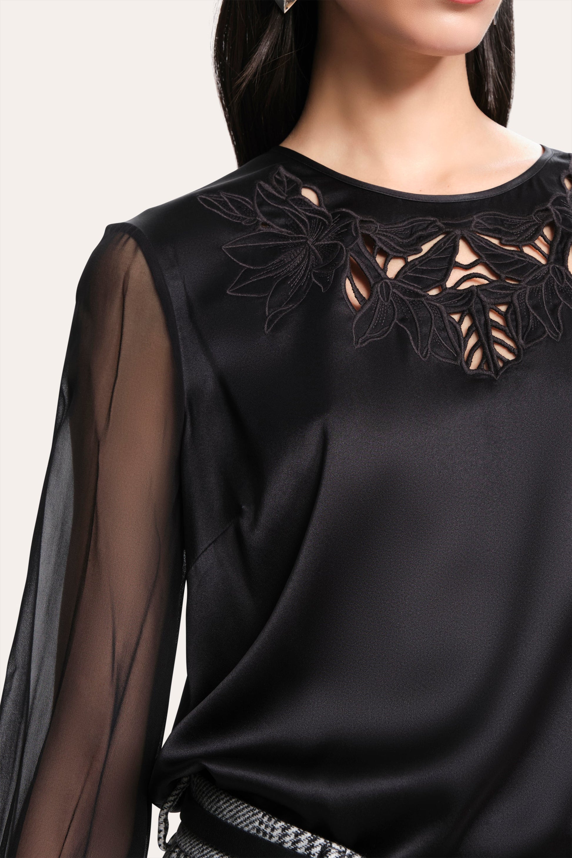 This silk satin bodice shirt features sheer chiffon sleeves and delicate embroidery at the chest, blending sculpted softness with artisanal elegance.