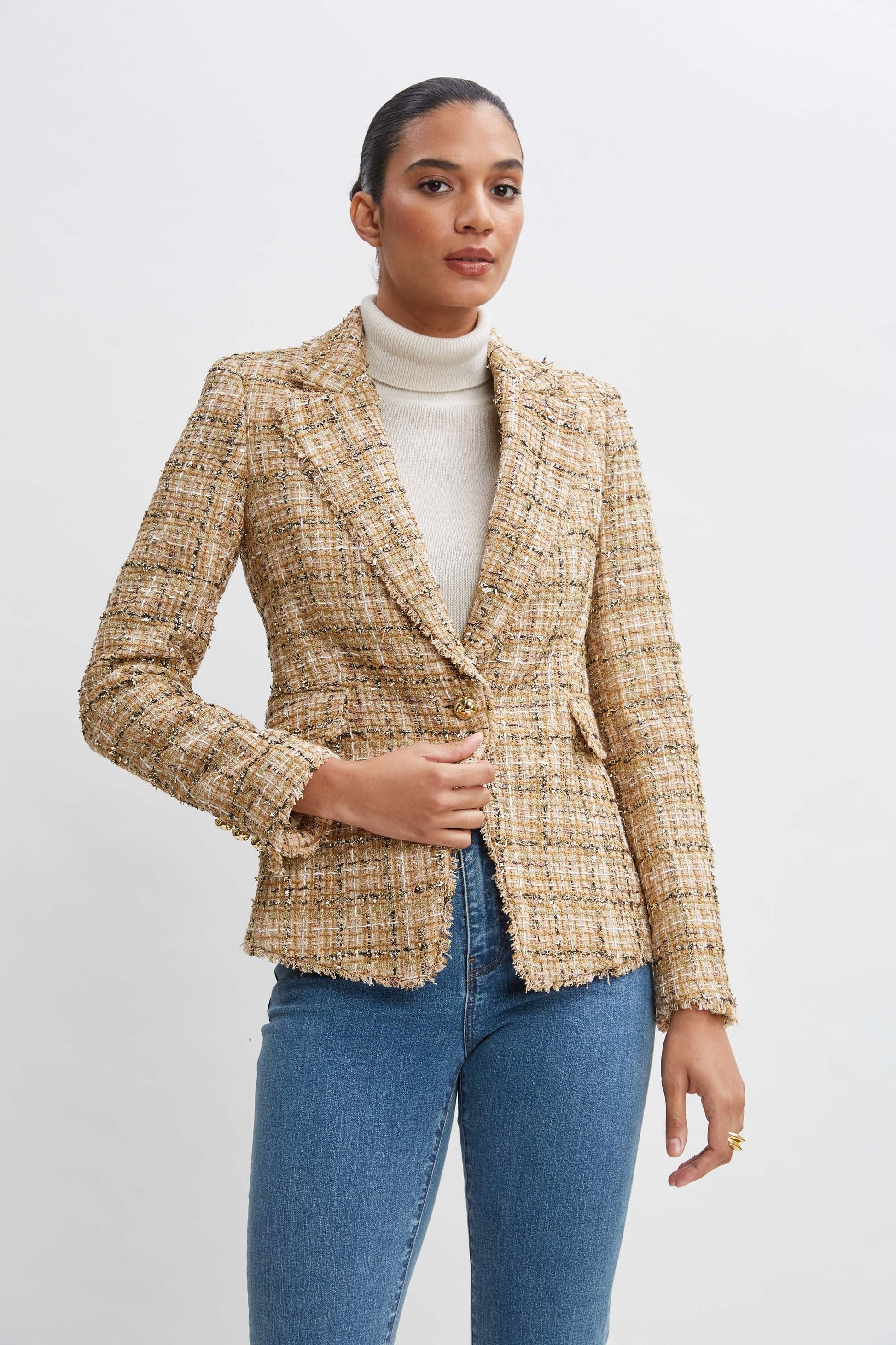 Elie chose a sophisticated Italian metallic tweed for his signature blazer. Single breasted with peaked lapels, the impeccable fit lends a body skimming silhouette. Detailed with fringe & gold crest buttons, it has the designer vibe you are looking for.