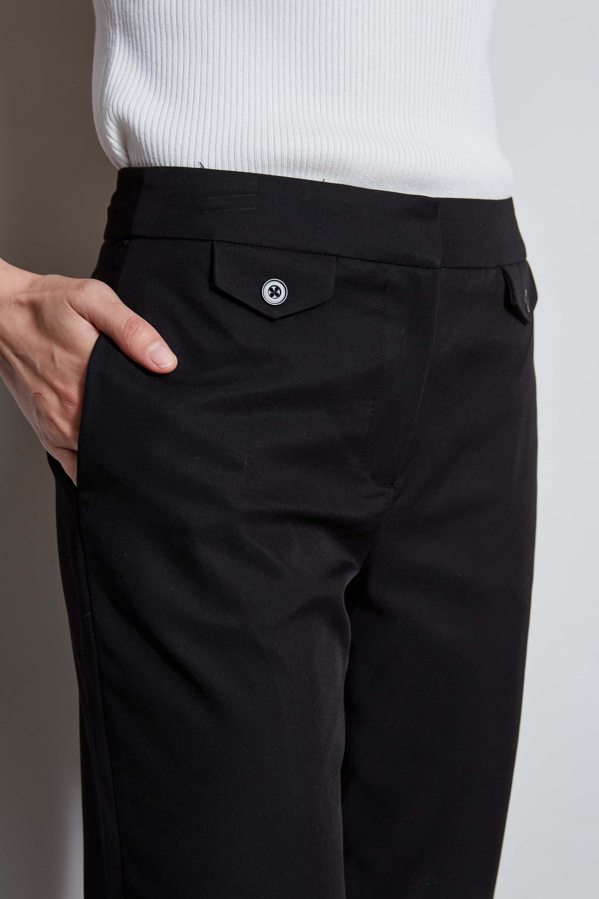Our slim leg pant have a modern twist with graphic buttons & a front pocket. In essential crepe, these pants are perfect for work or dinner.