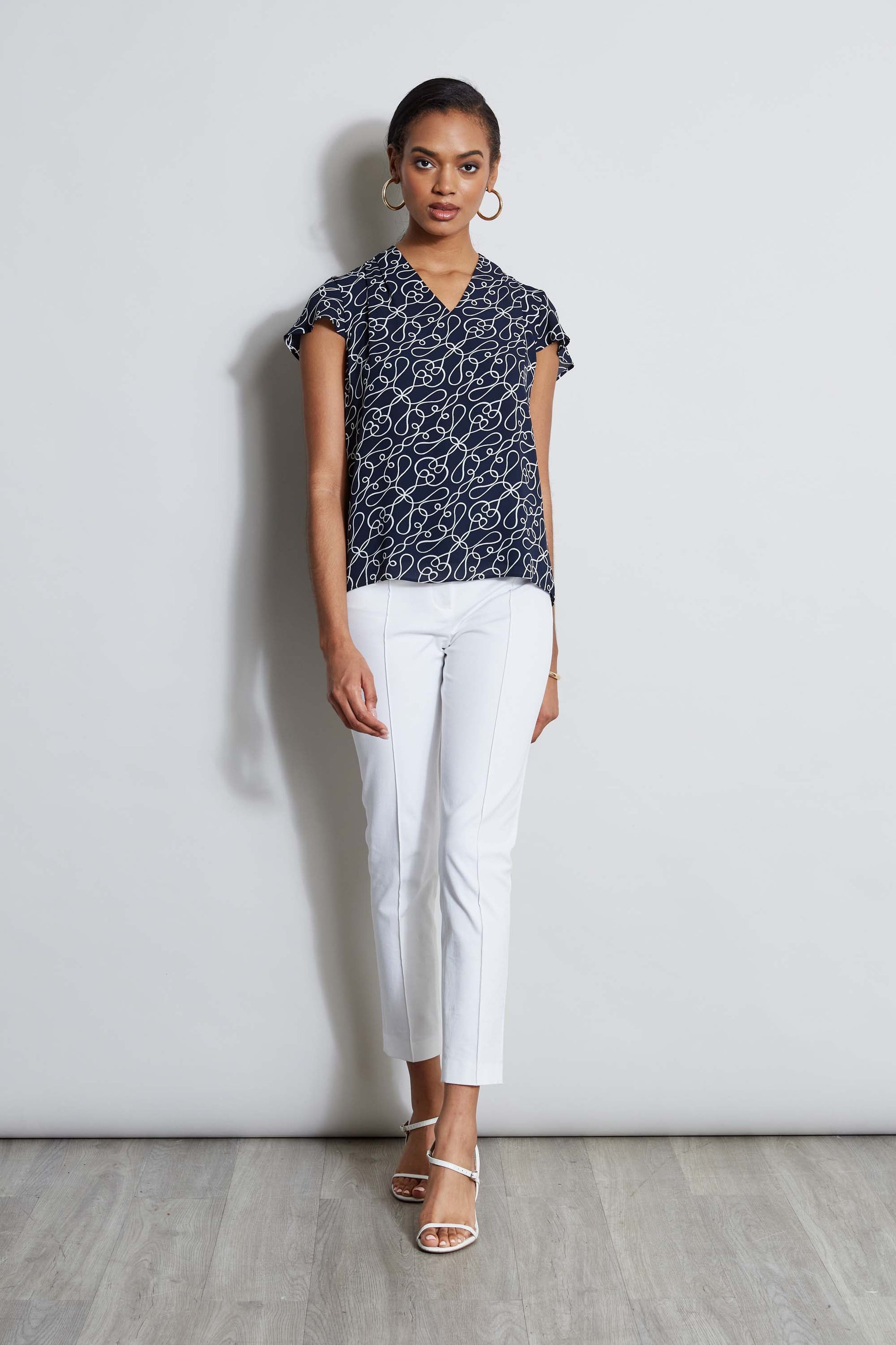 Chic & effortless, meet the perfect short sleeve top for Spring. Designed with a v-neck line & soft cap sleeves, this printed luxe georgette top will carry you from Spring to Fall.
