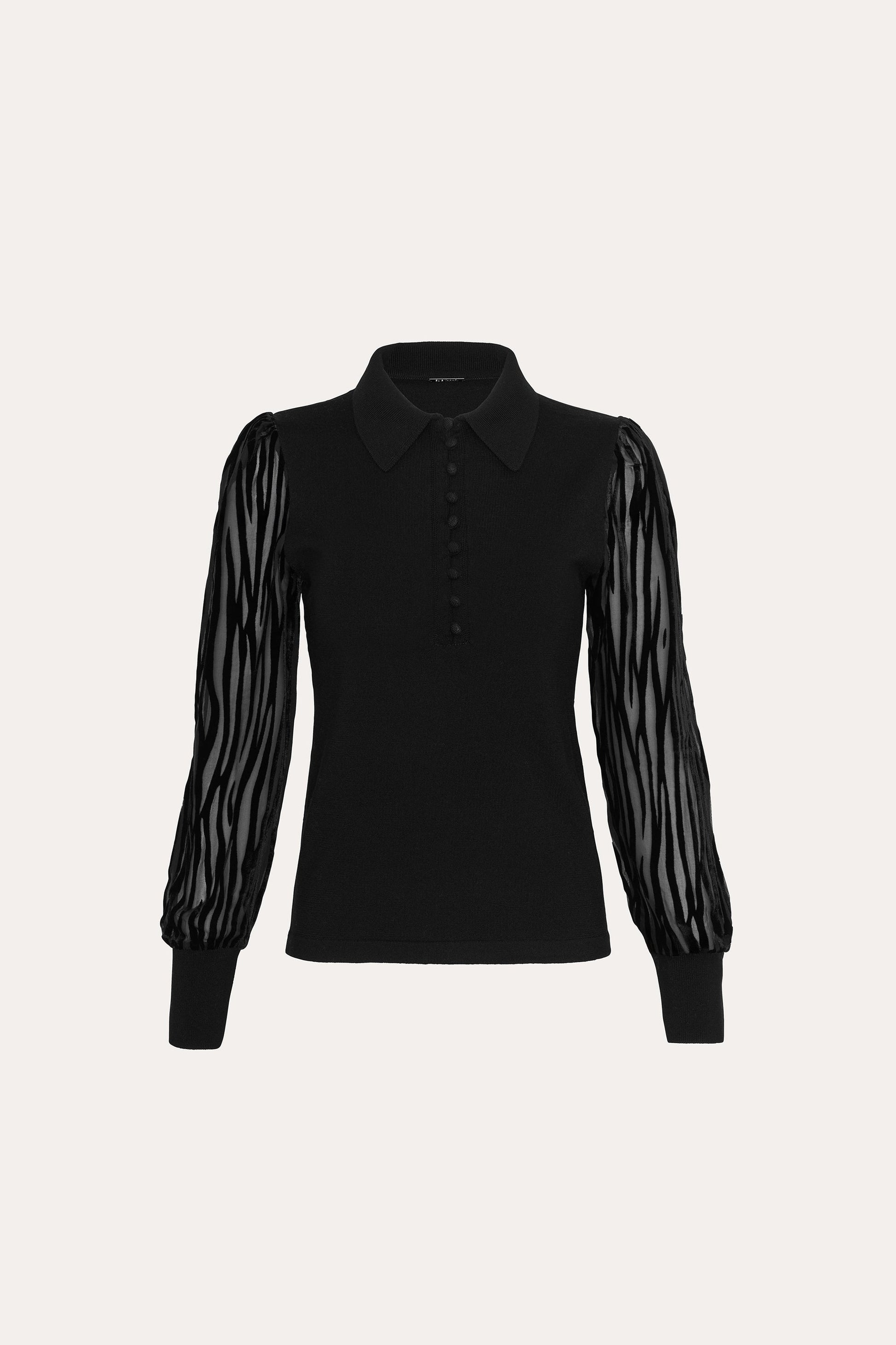 • Long Velvet Burnout Sleeve Polo Merino Wool Sweater