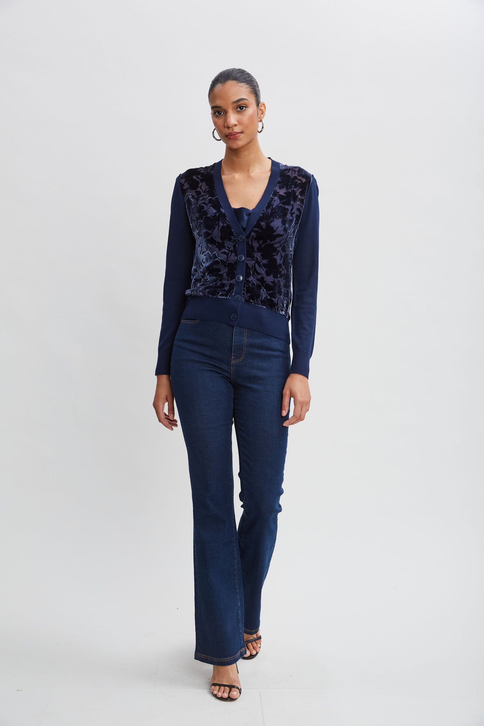 The mix of soft touch merino with burnout silk/viscose velvet lends new definition to the cardigan sweater. The v-neckline makes it perfect for layering over our Satin Cami or a Tee.