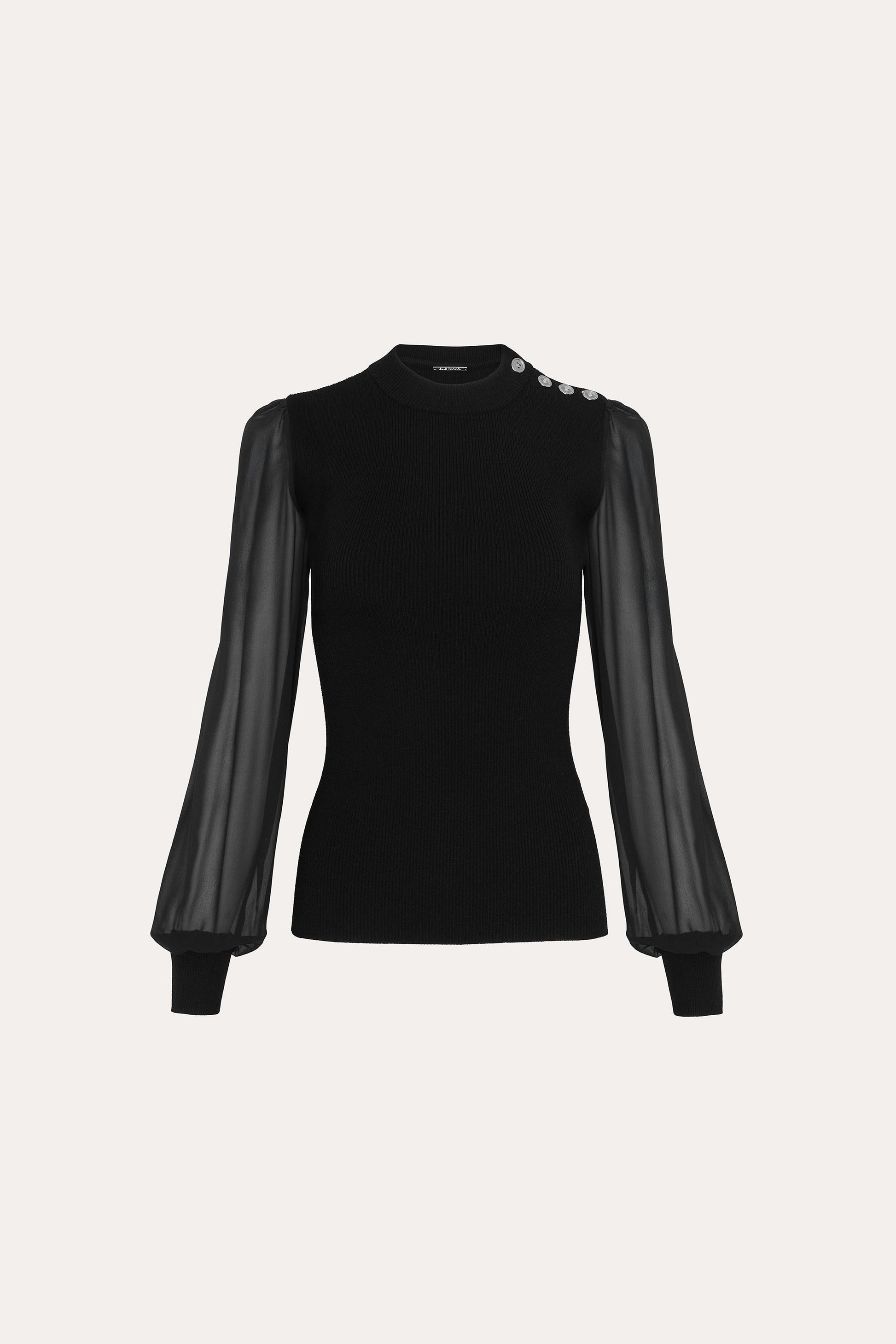 • Mock Neck Rib Knit with Buttons on the Shoulder & Chiffon Sleeves