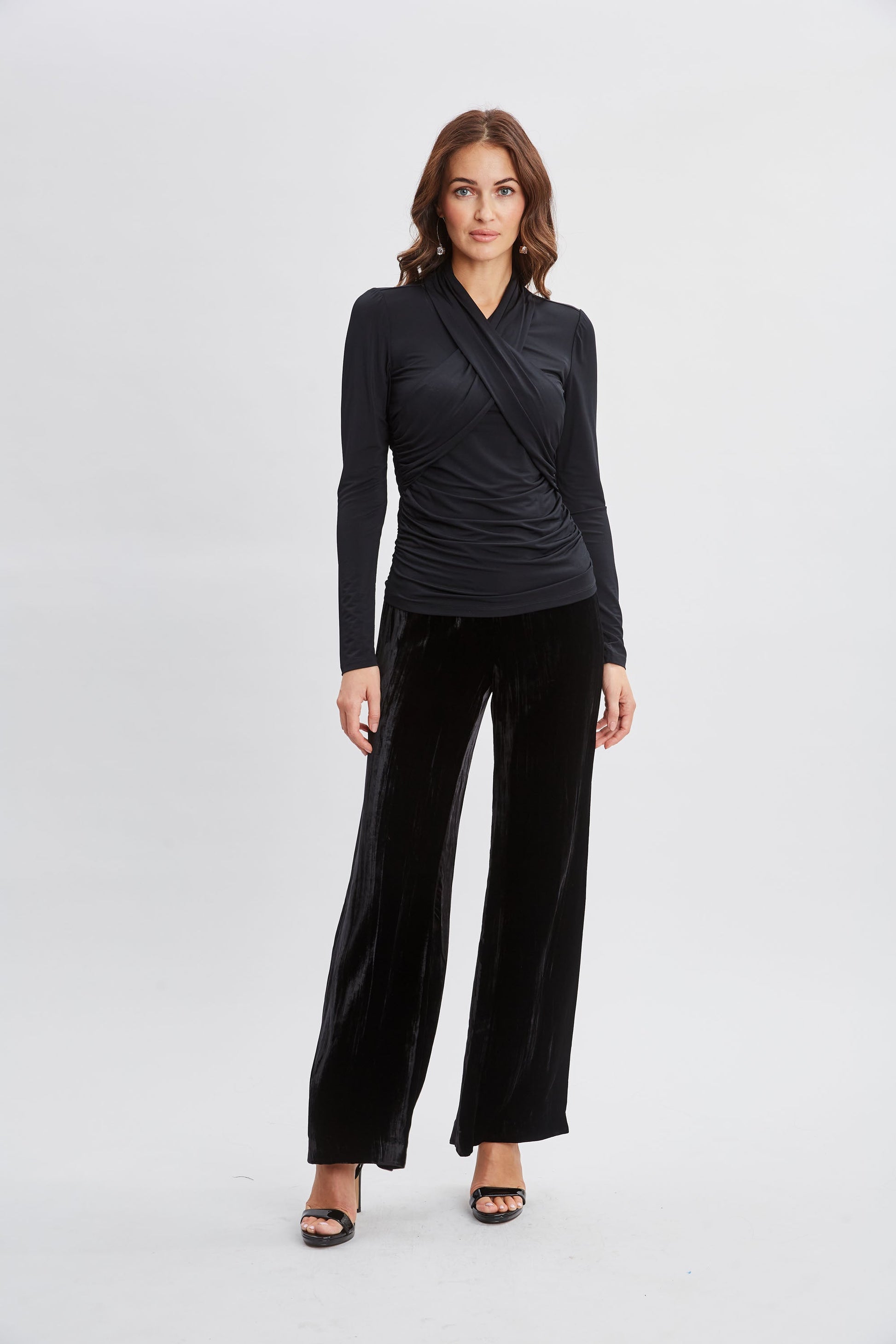 • Long Sleeve Crossover Ruched Matte Jersey Knit T-Shirt