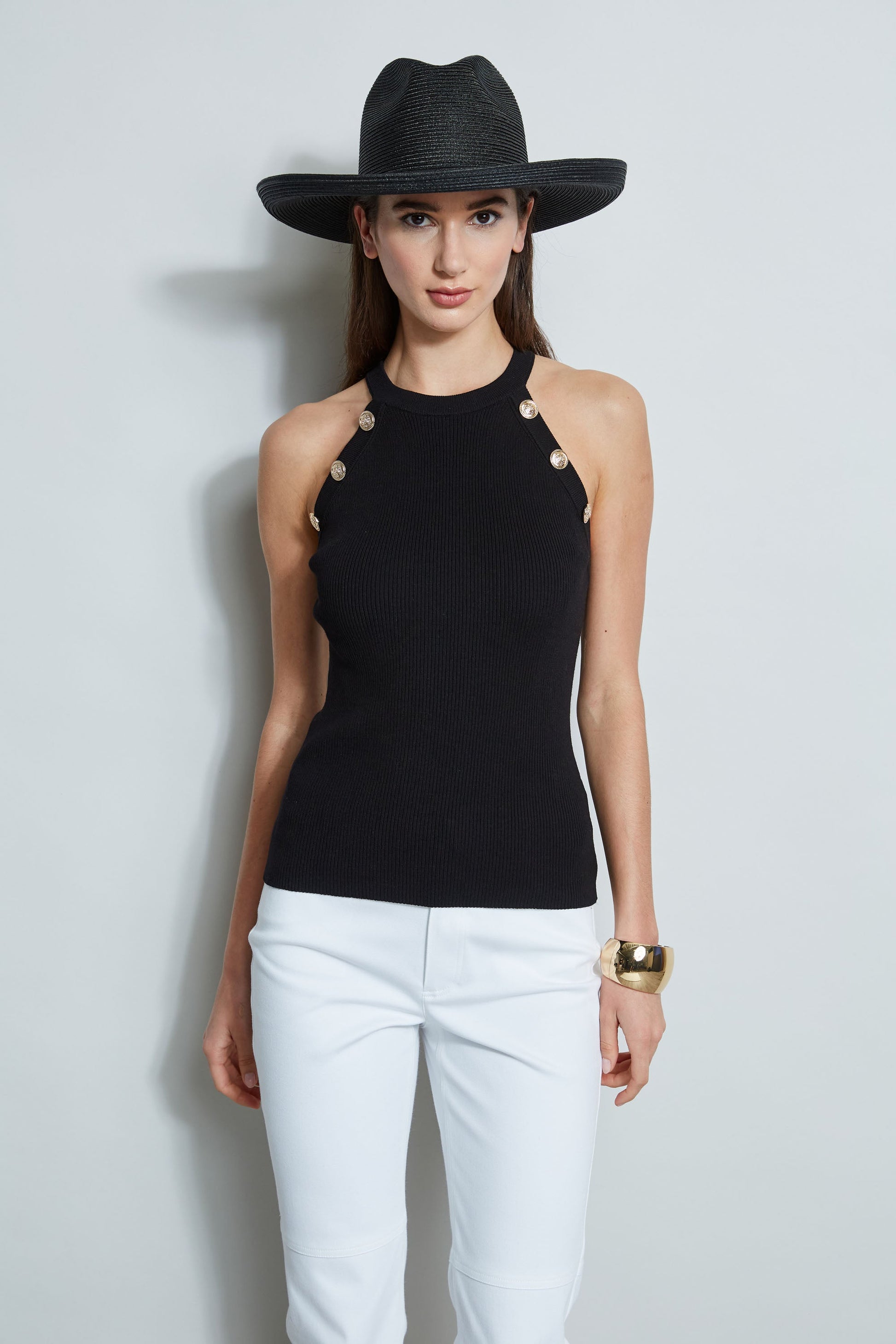 It's all about the bold gold buttons that detail our Ribbed Halter Neck Knit. Perfect for wearing on its own with our Lace Palazzo Pants or Denim, this knit will become your go-to piece