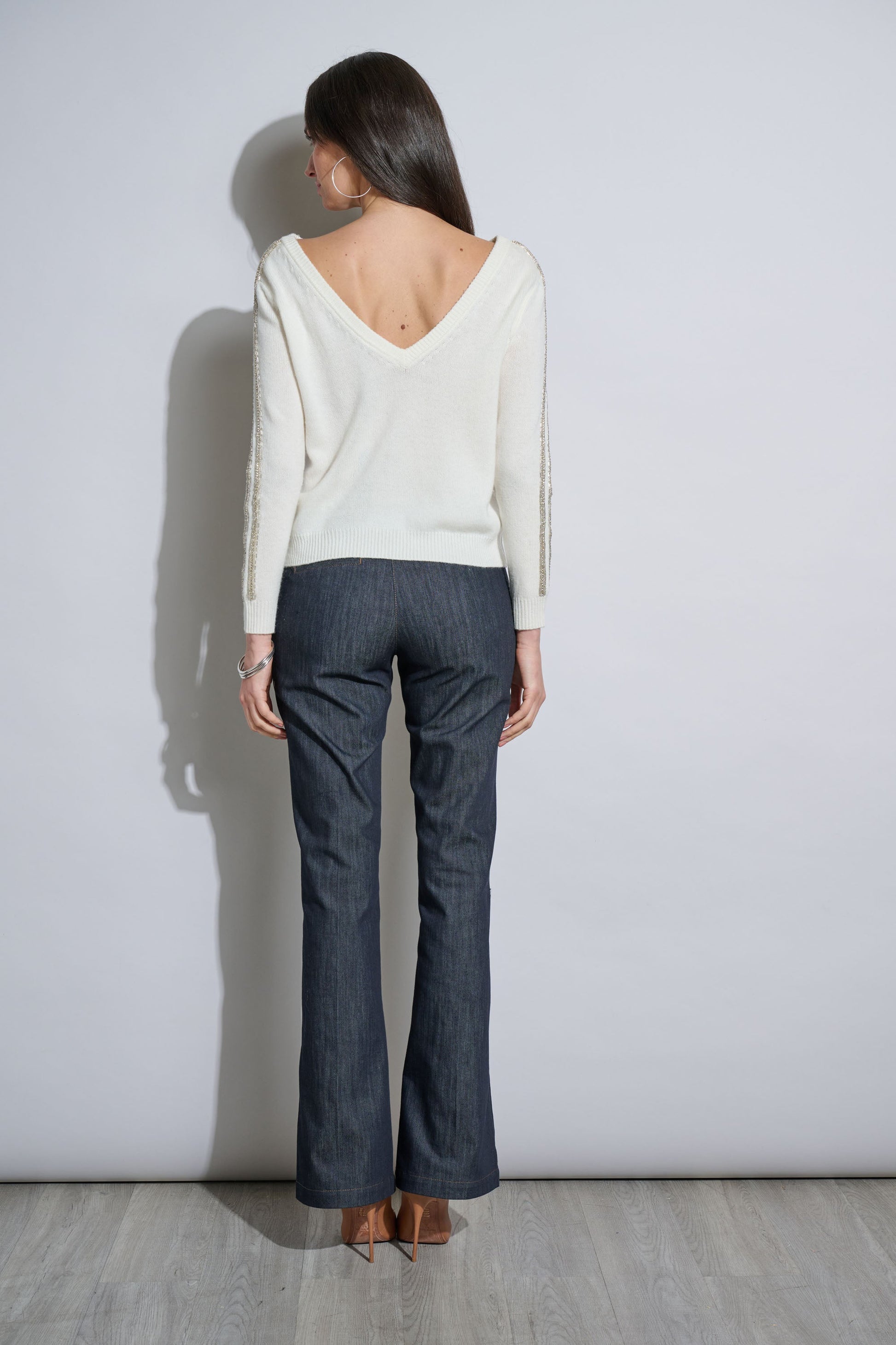 Our Cashmere Merino Sweater makes a statement entrance and exit. The modern ballet neckline front leads into a v back neckline. Designed with metallic crystal trim stripes down the arm, this easy fit sweater is perfect for cooler days. Long Sleeve Scoop Neck Cashmere Merino Wool Pullover Sweater