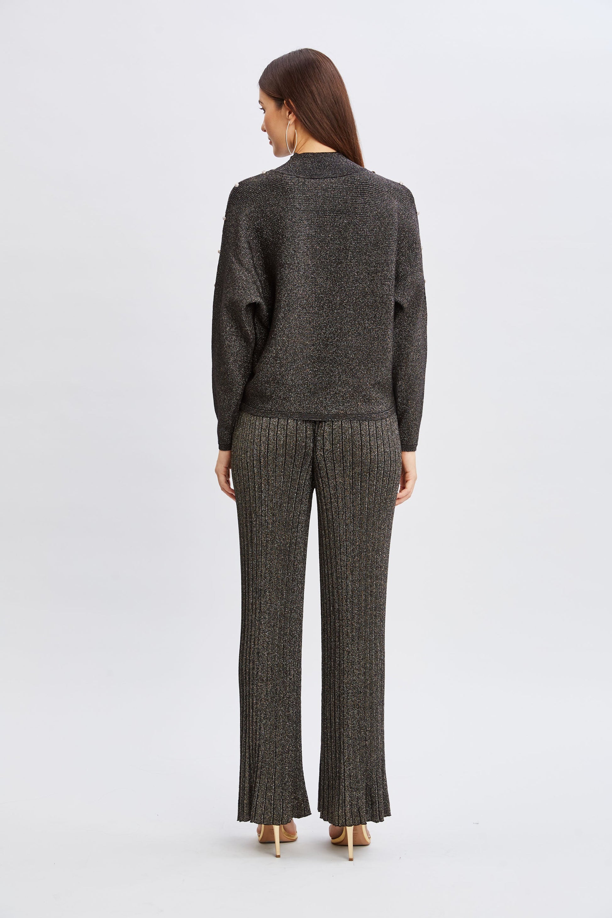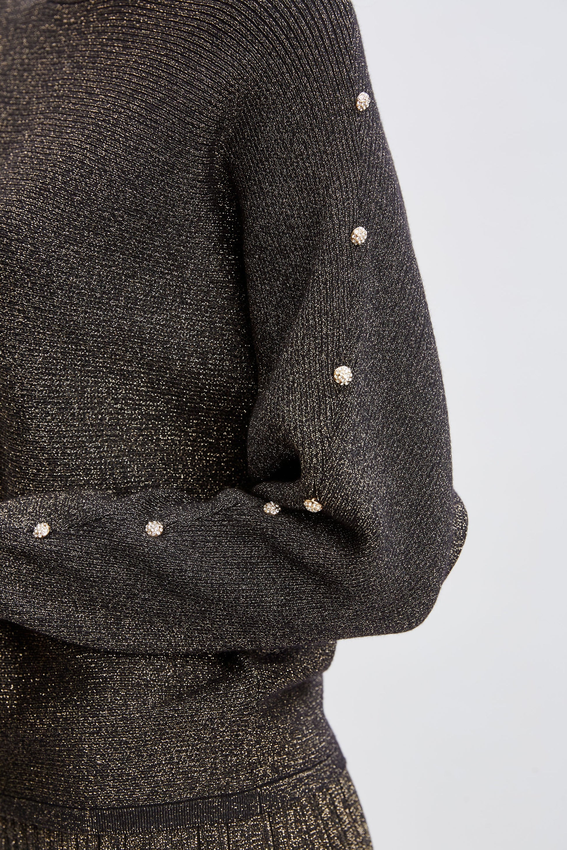 Designed with crystal detailing on the dropped shoulder sleeves, our relaxed fit sweater will be your go-to for Fall. Perfect for when the temperature drops, you will love look and feel of this metallic sweater.
