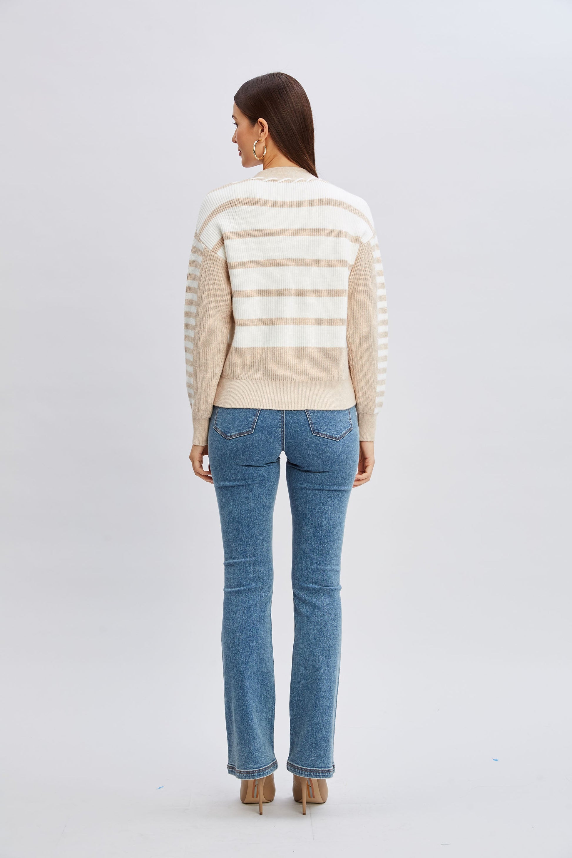 Designed to be your next go-to cardigan. Our Contrasting Stripe Sweater has a v-neckline and is detailed with contrasting trim buttons. Wear it layered with a tank with crepe or denim – it’s perfect for day or a night.
