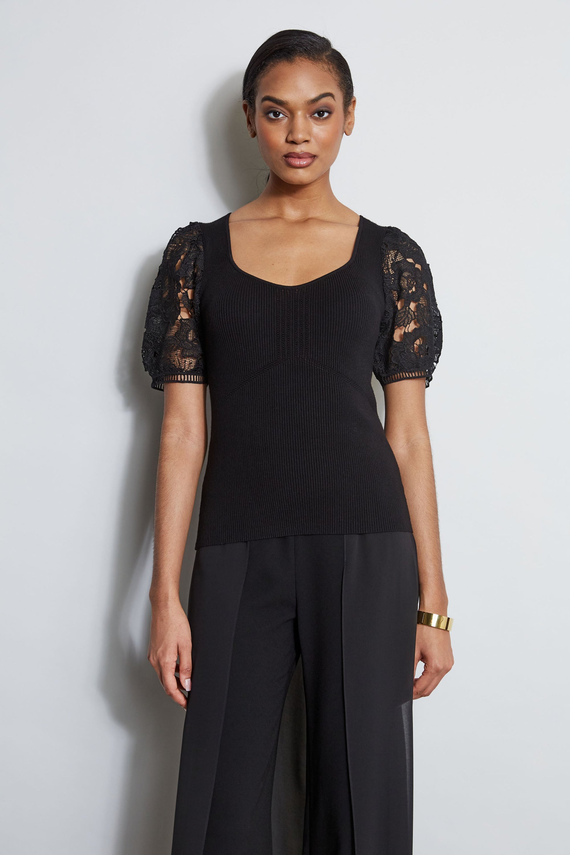 By mixing luxe Viscose with romantic openwork lace sleeves, this sweater is instantly transformed into something special. Modern and femme, it features contour neckline & body skimming silhouette. Dress it up or down with our favorite denim jean.