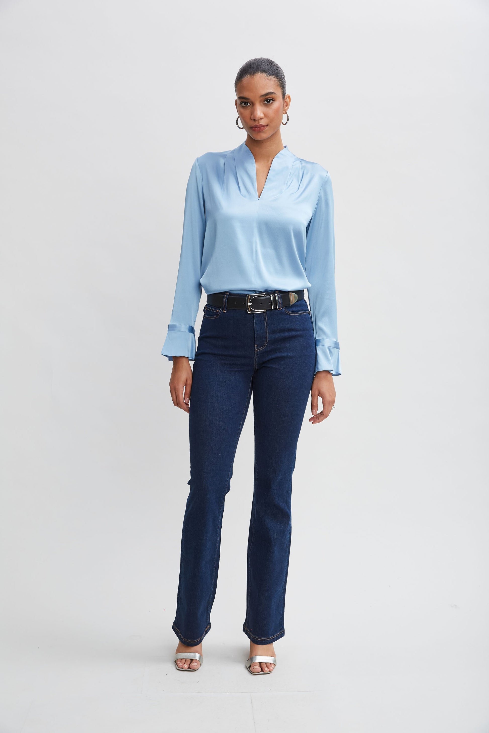 Silk Satin Contour Neck Ruffle Cuff Shirt