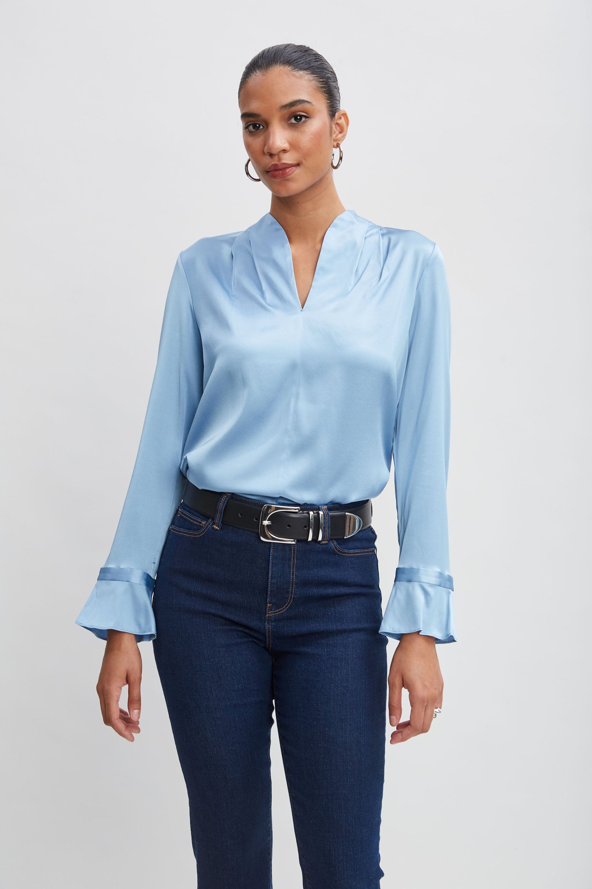 Effortlessly chic, this shirt is destined to become a favorite. Luxurious Silk Satin elevates this minimalist top. With its contour neckline, soft pleat detail & tiered ruffle cuffs, this essential piece will take you from Fall to Spring.