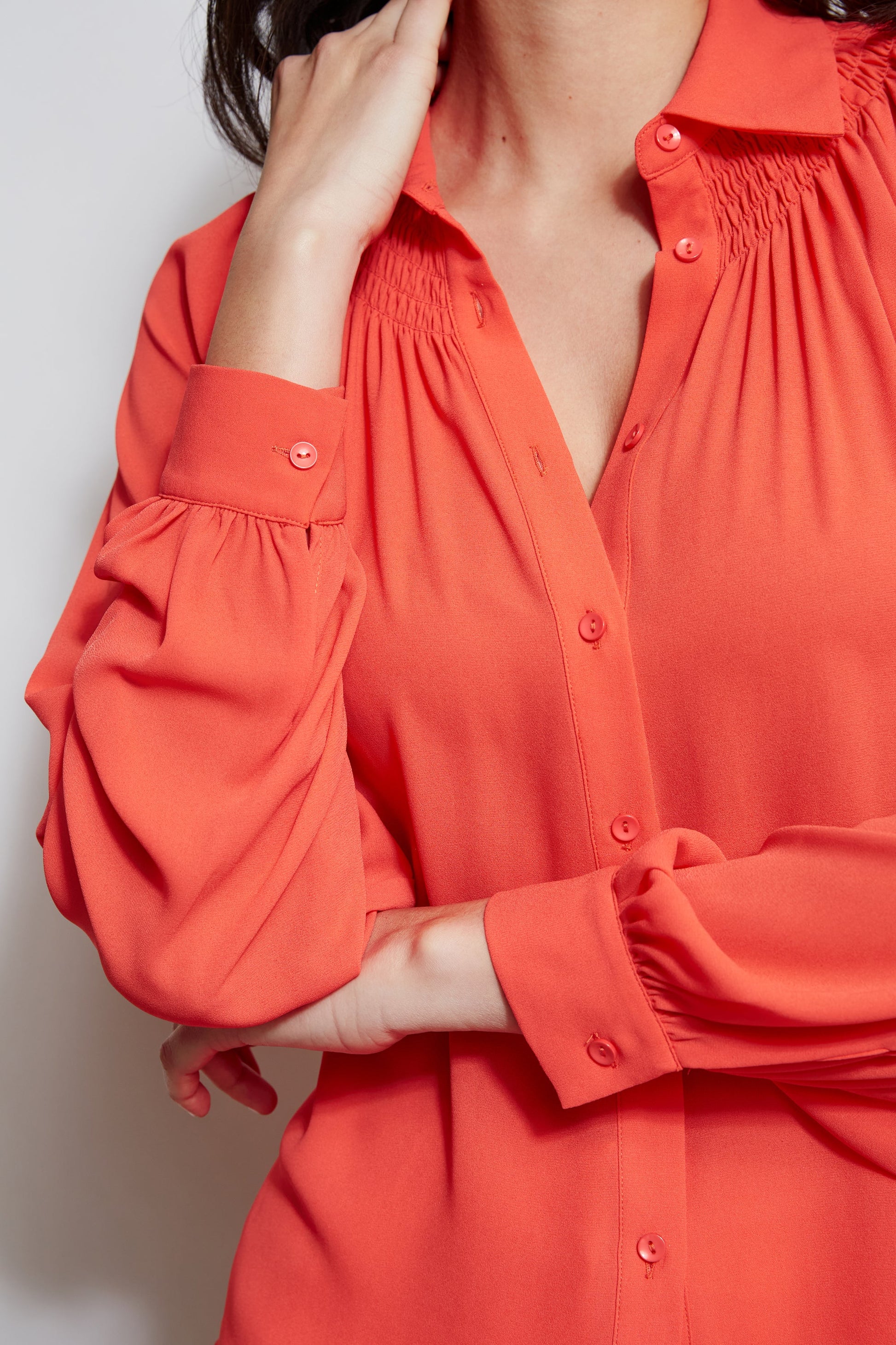 The smocking at the neck lends designer attitude to this classic button down shirt. Featuring long sleeves & a relaxed fit, this shirt works as well with denim as it does with neutrals.