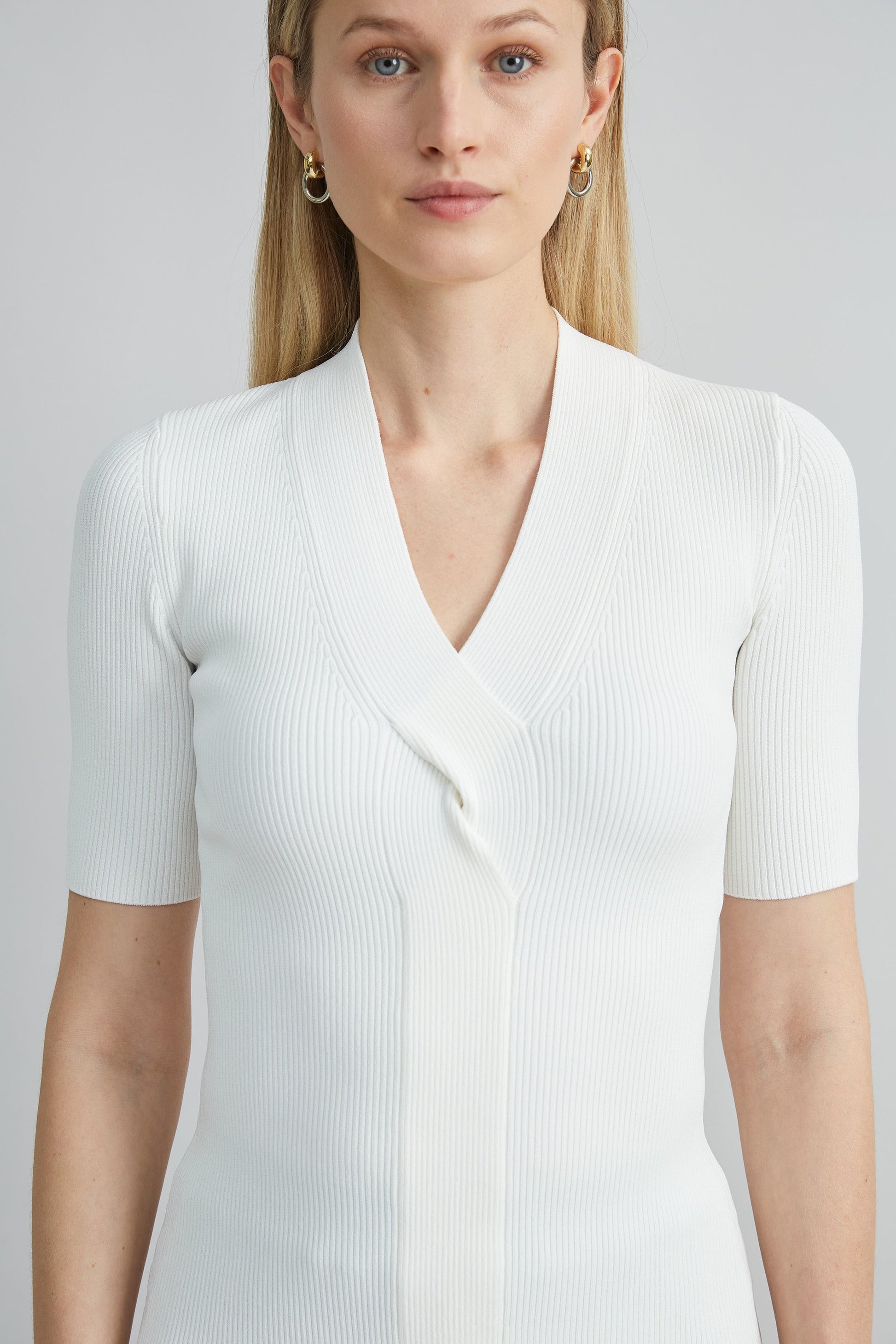 • Short Sleeve Rib Knit Sweater with V-neck Twist Front