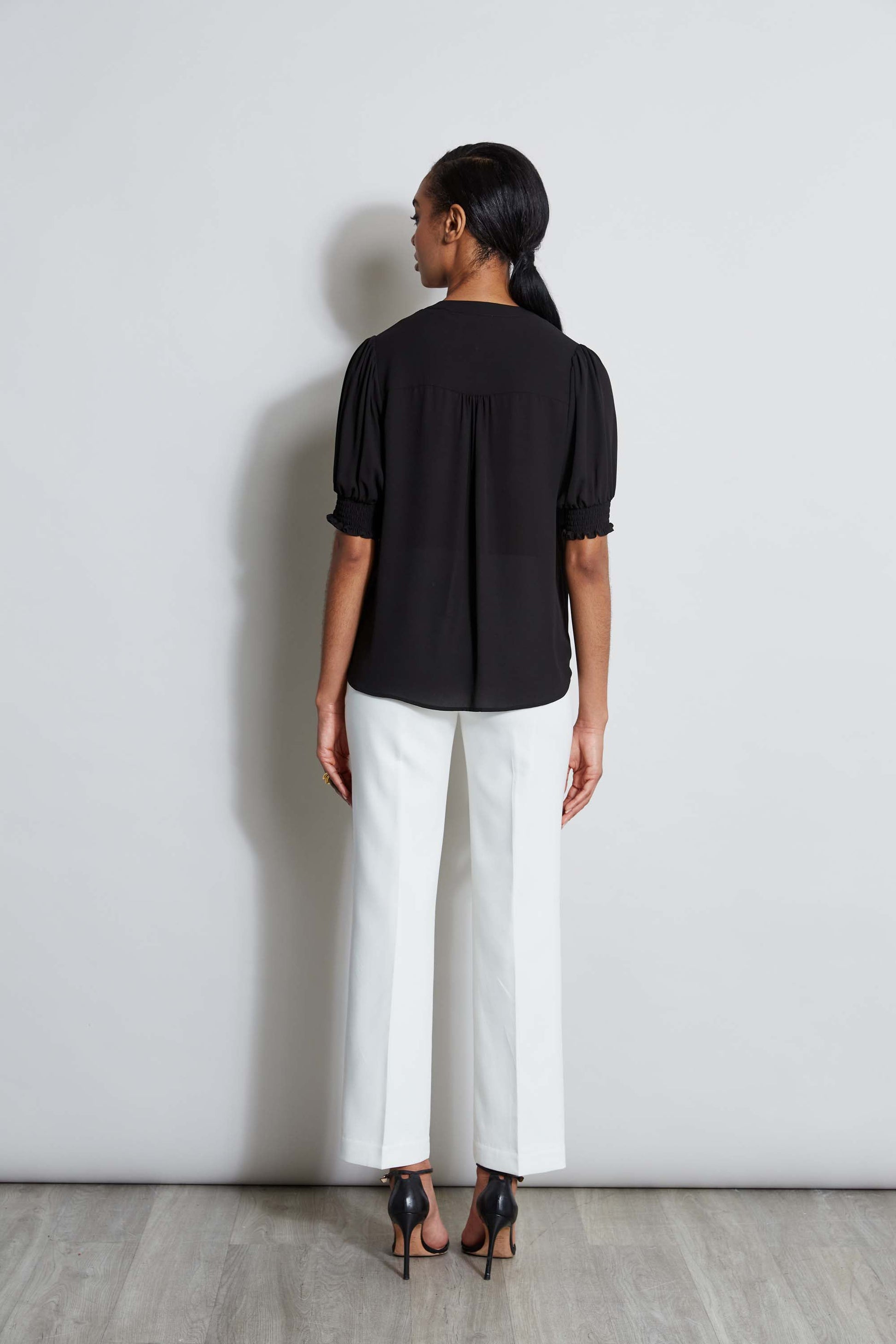 Chic & effortless, meet the perfect short sleeve top for Spring. Designed with smocking detailing & a split neckline, this luxe georgette top will take you from Spring to Fall.