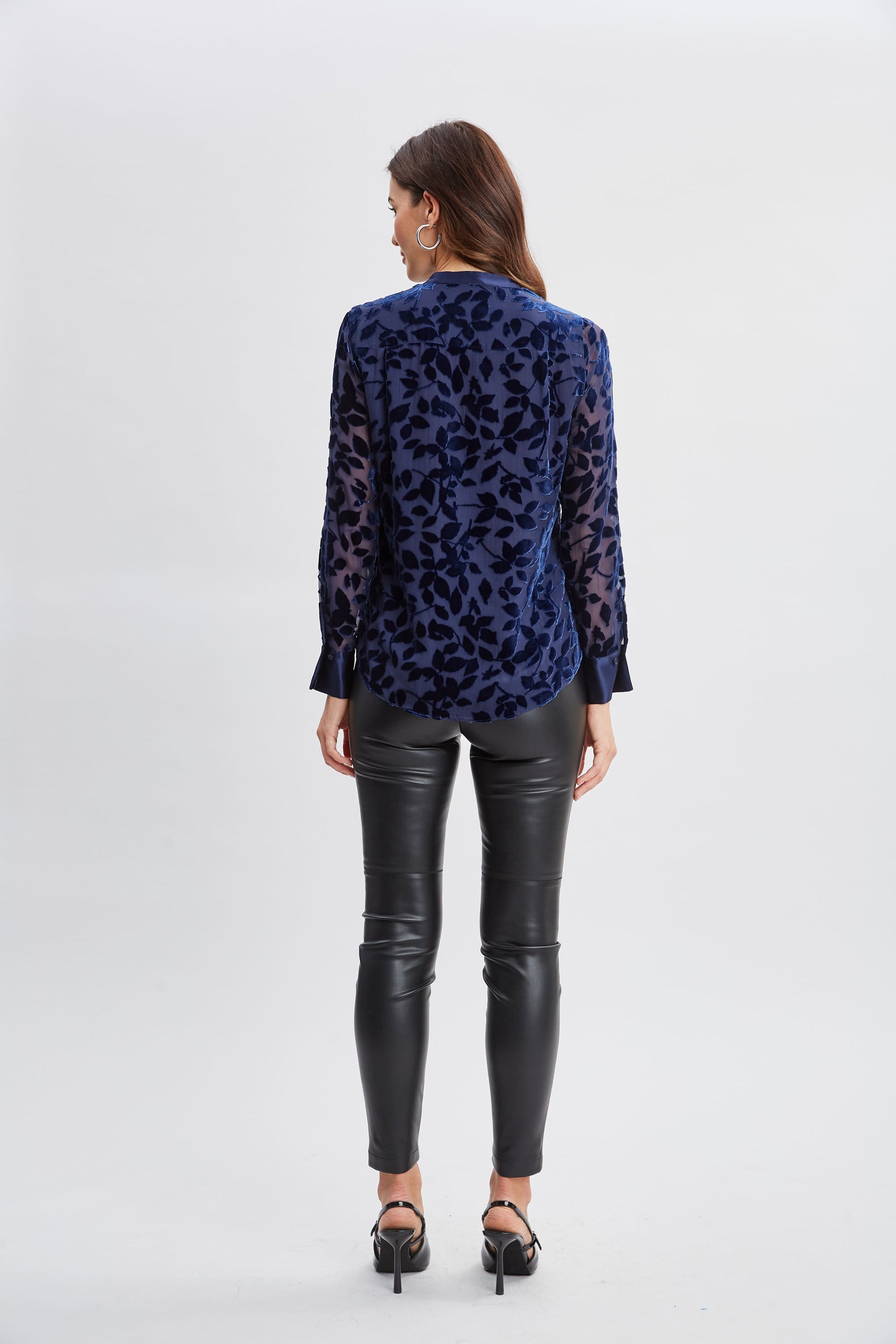 This is the top with the wow factor. A luxe burnout floral velvet lends the designer touch. The contrasting Satin stand collar, hidden button placket & cuffs adds a contrast patina to the burnout velvet - perfect for a cool fall night out.