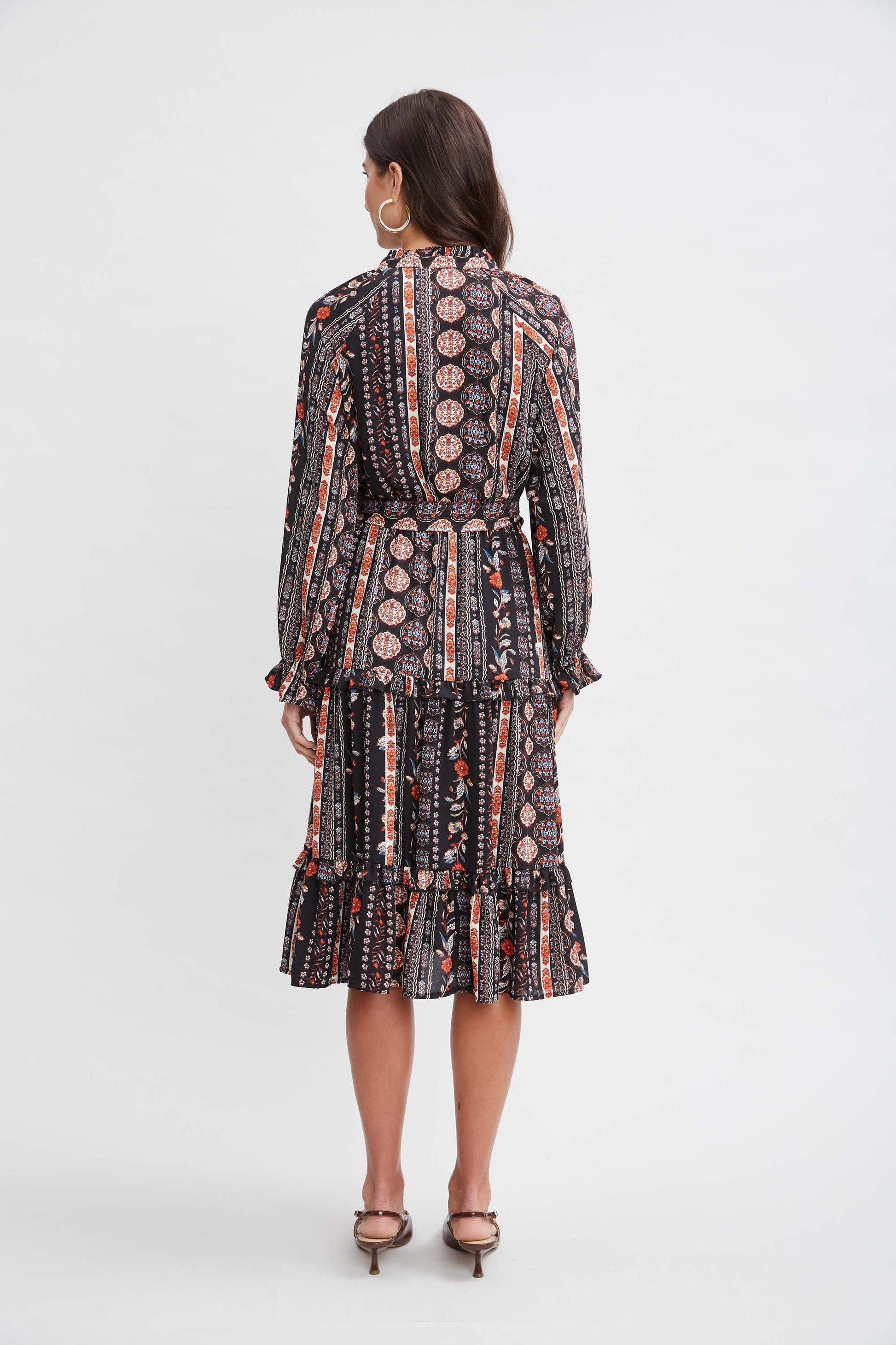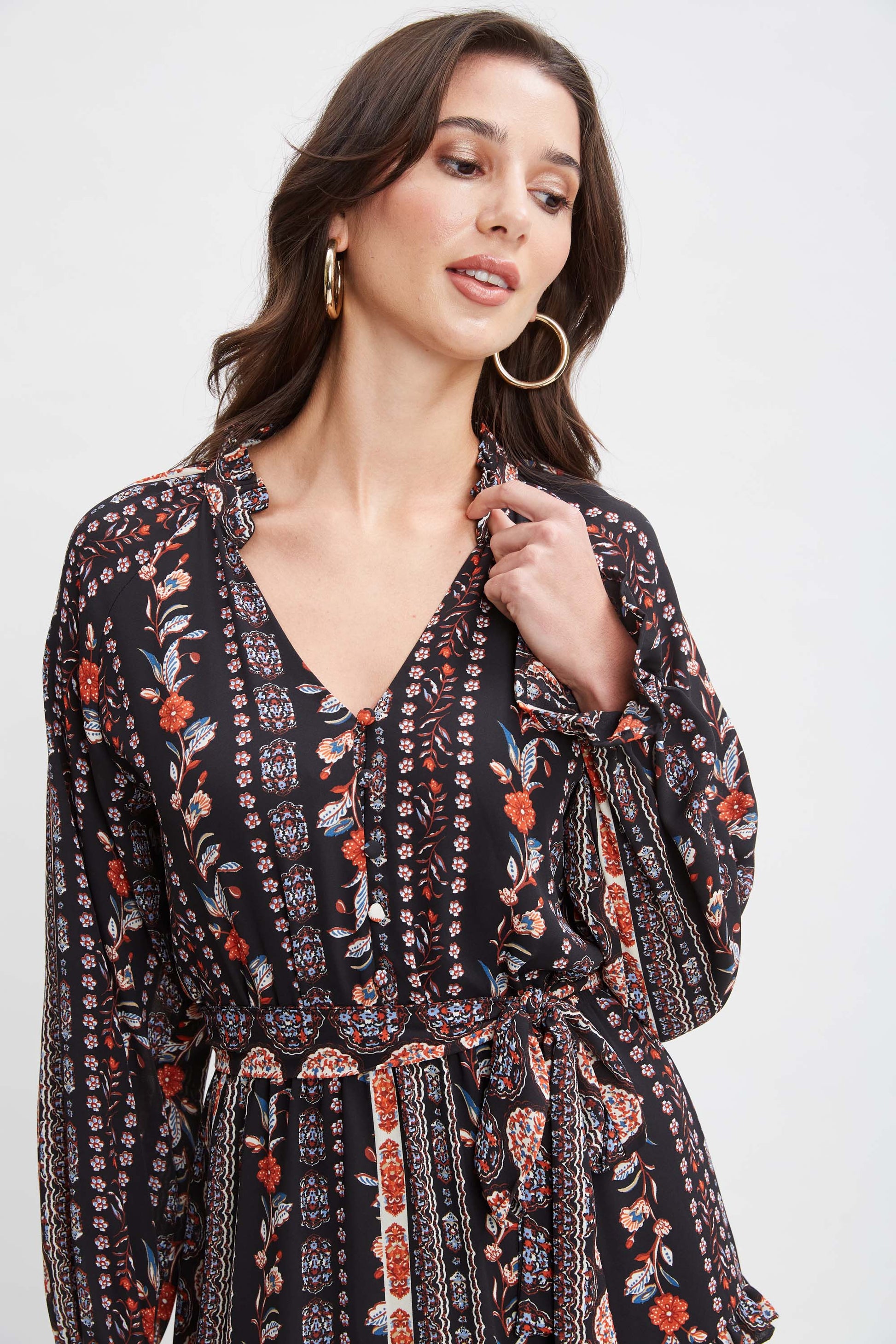 Effortless & playful, the self-sash and tiered skirt of our Spanish Garden Print dress gives it an artistic edge. Designed with a ruffle collar, split neckline & full skirt, this geometric floral print shirt dress speaks of a new season. Dress it down with flats or up with sexy sandals for a special occasion.