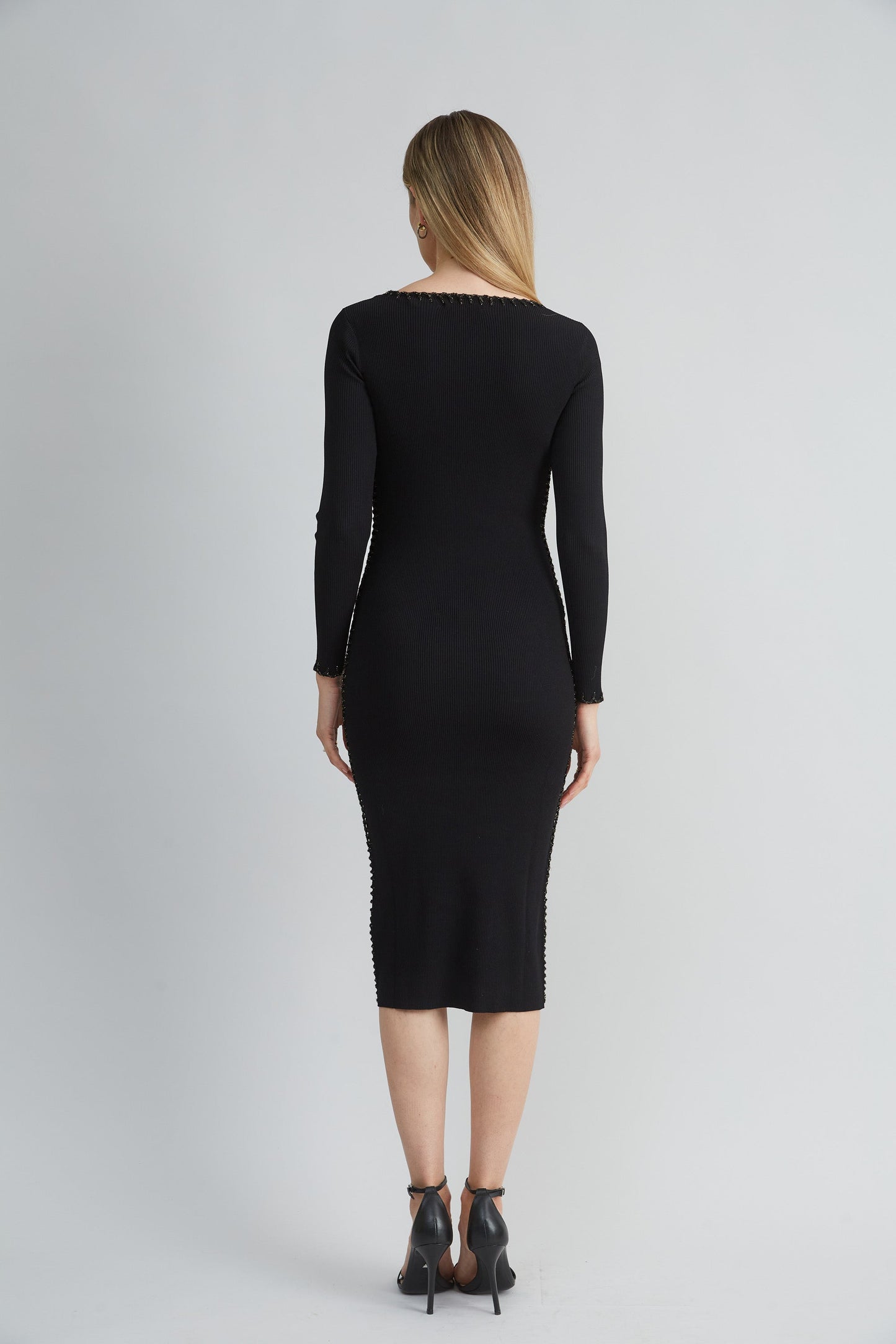 • Long Sleeve Sweetheart Neck Sweater Dress with Metallic Stitching