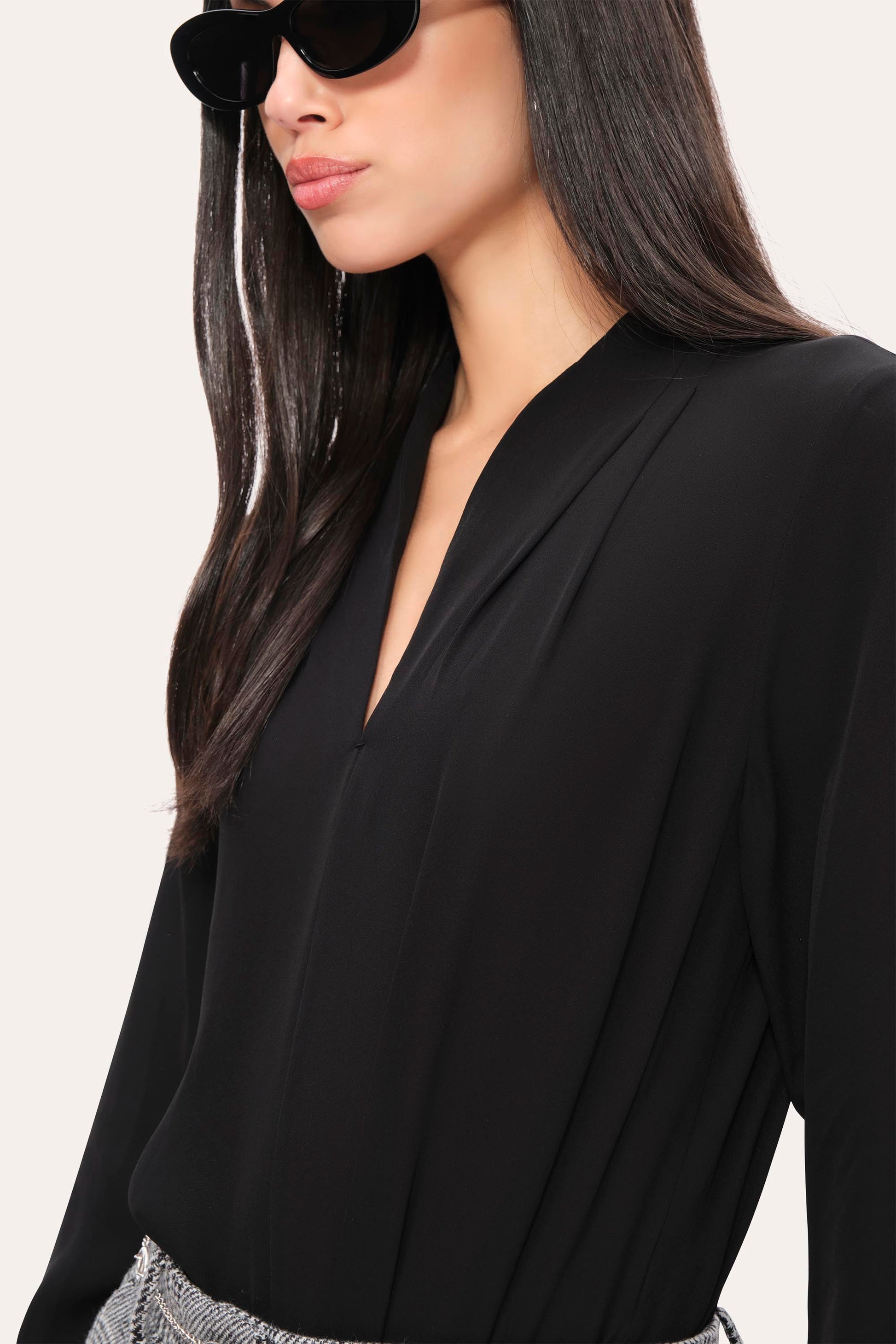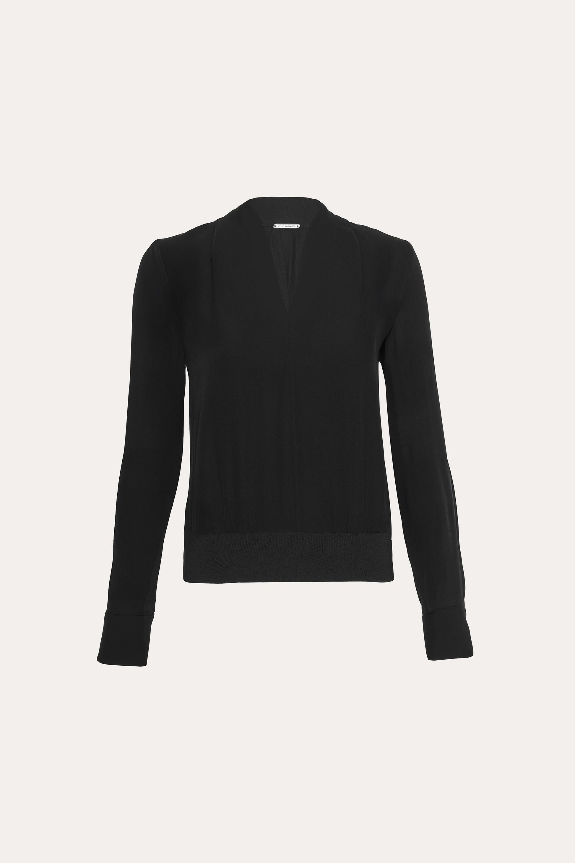 • Long Sleeve Silk Top with split neckline & rib hem