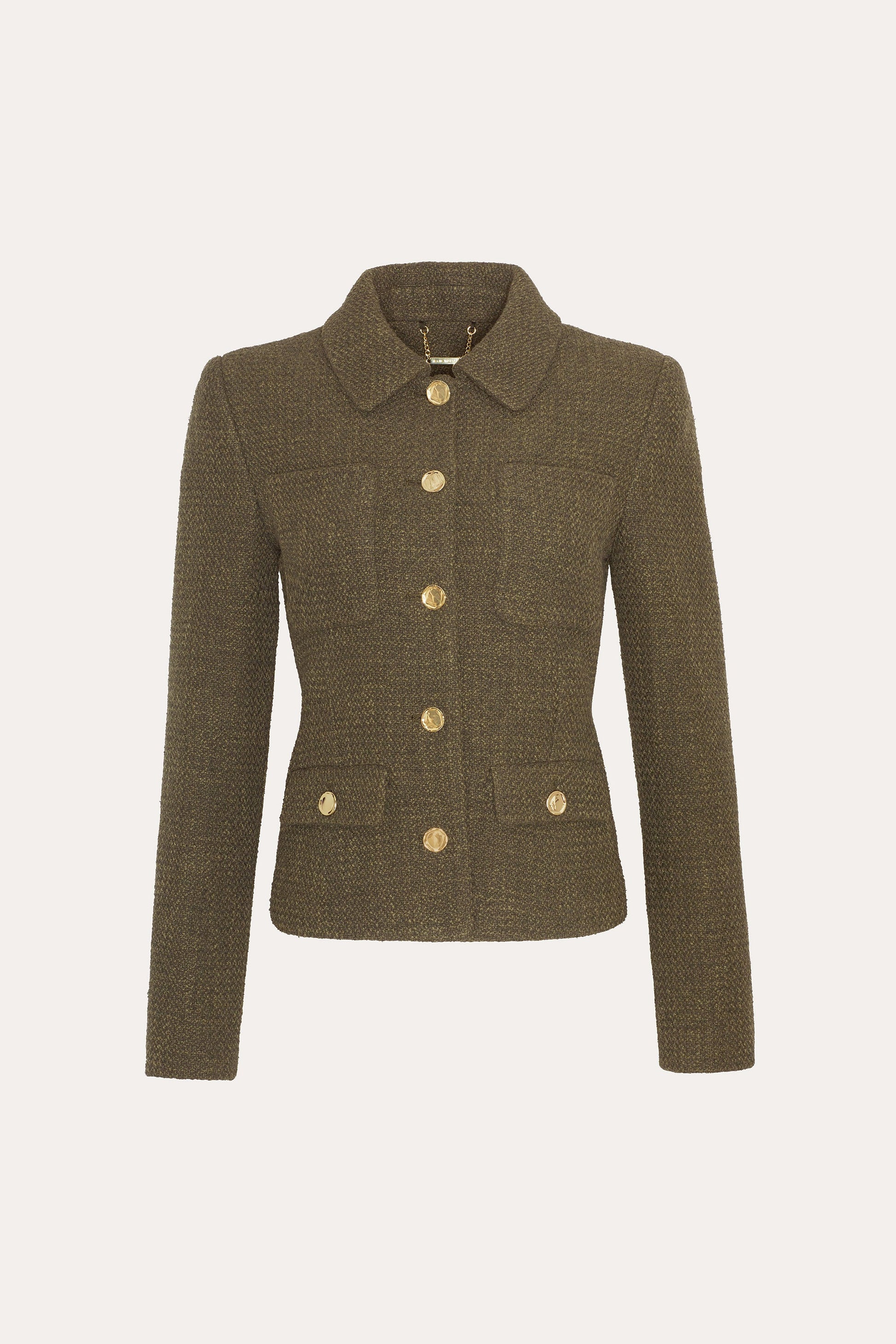 Twisted tweed jacket with strong shoulders, patch pockets, and hammered gold buttons. A modern take on a heritage silhouette, it pairs well with denim or our twisted tweed skirt for a polished look.